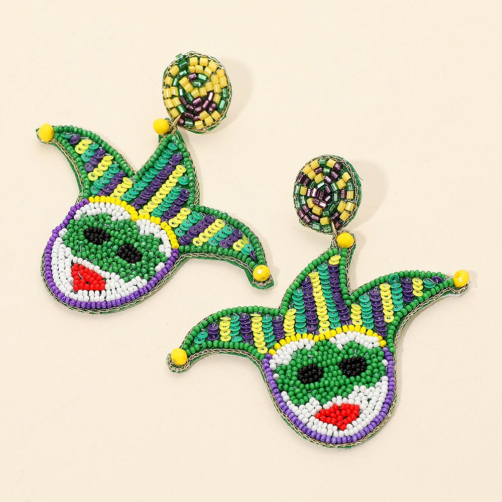 Details • Size : 3" X 3.1" • Post Back • Playful statement drop earrings designed with a festive jester motif and intricate detailing to create bold movement and instant visual impact. Ideal for Mardi Gras celebrations, costume parties, parades, and standout holiday or event styling. • Lead and Nickel Compliant • Made In India