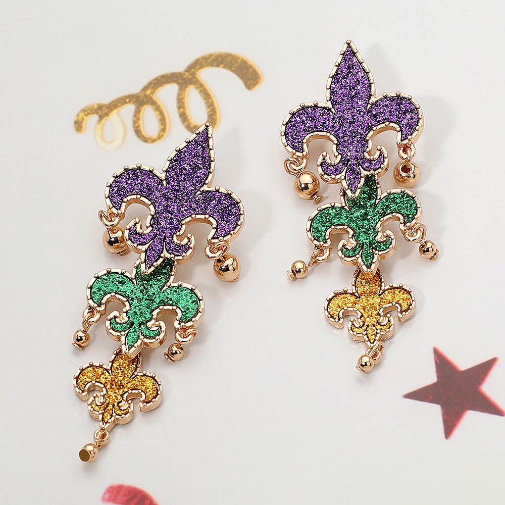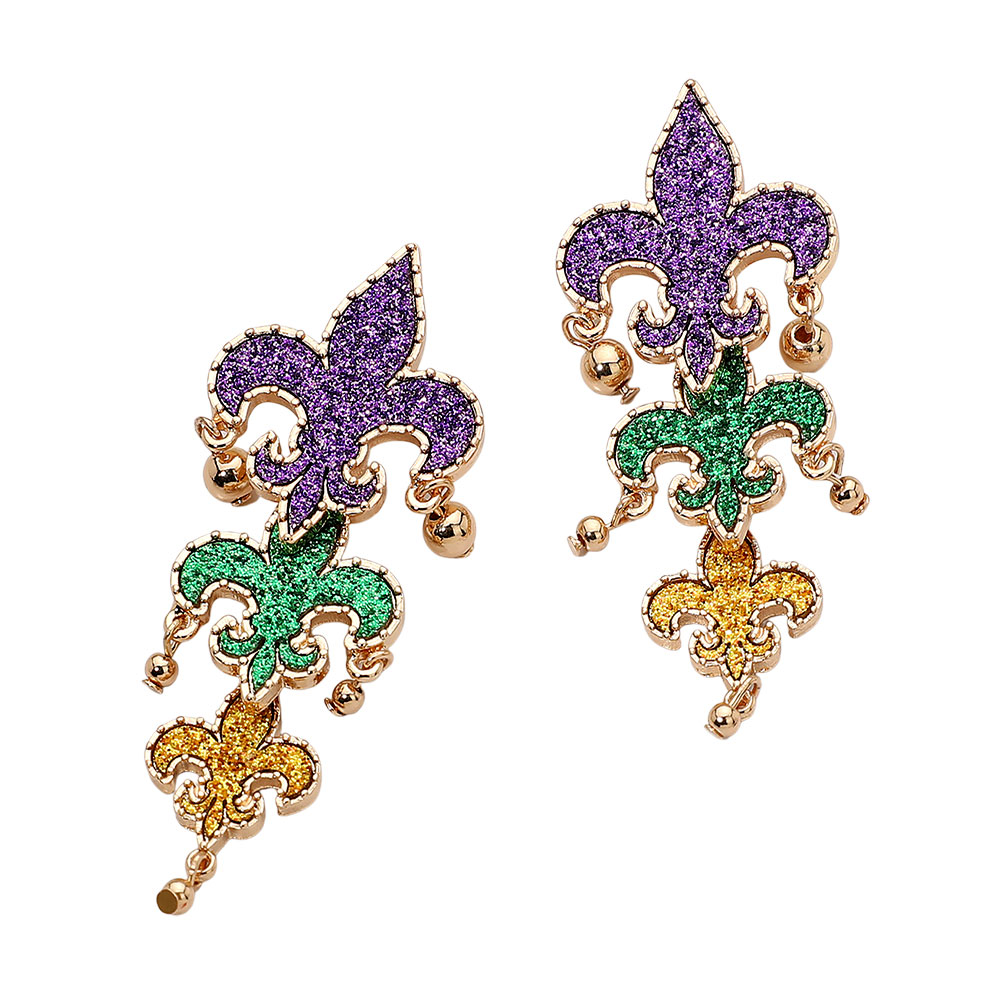 • Make a bold statement this Mardi Gras with these stunning triple fleur-de-lis drop earrings, featuring layered glitter details and festive charm. Perfect for parties, parades, and celebrations, they capture the lively carnival essence and add dazzling flair to any festive outfit.