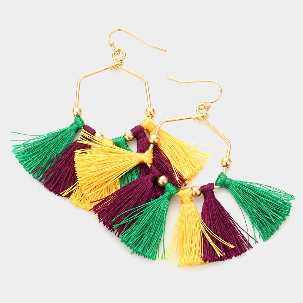 Mardi Gras Open Metal Hexagon Tassel Fringe Dangle Earrings