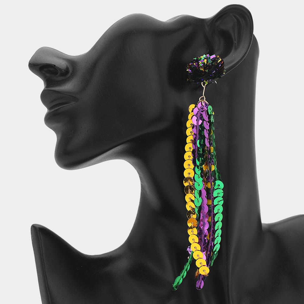 Details • Size : 0.8" X 5.5" • Post Back • These Mardi Gras sequin fringe drop earrings feature dramatic length and fluid movement for bold festive styling. Designed to elevate parade looks, party outfits, and themed events, they deliver eye-catching impact while remaining lightweight for comfortable wear, making them ideal for seasonal collections, gift assortments, and statement accessory displays. • Lead and Nickel Compliant
