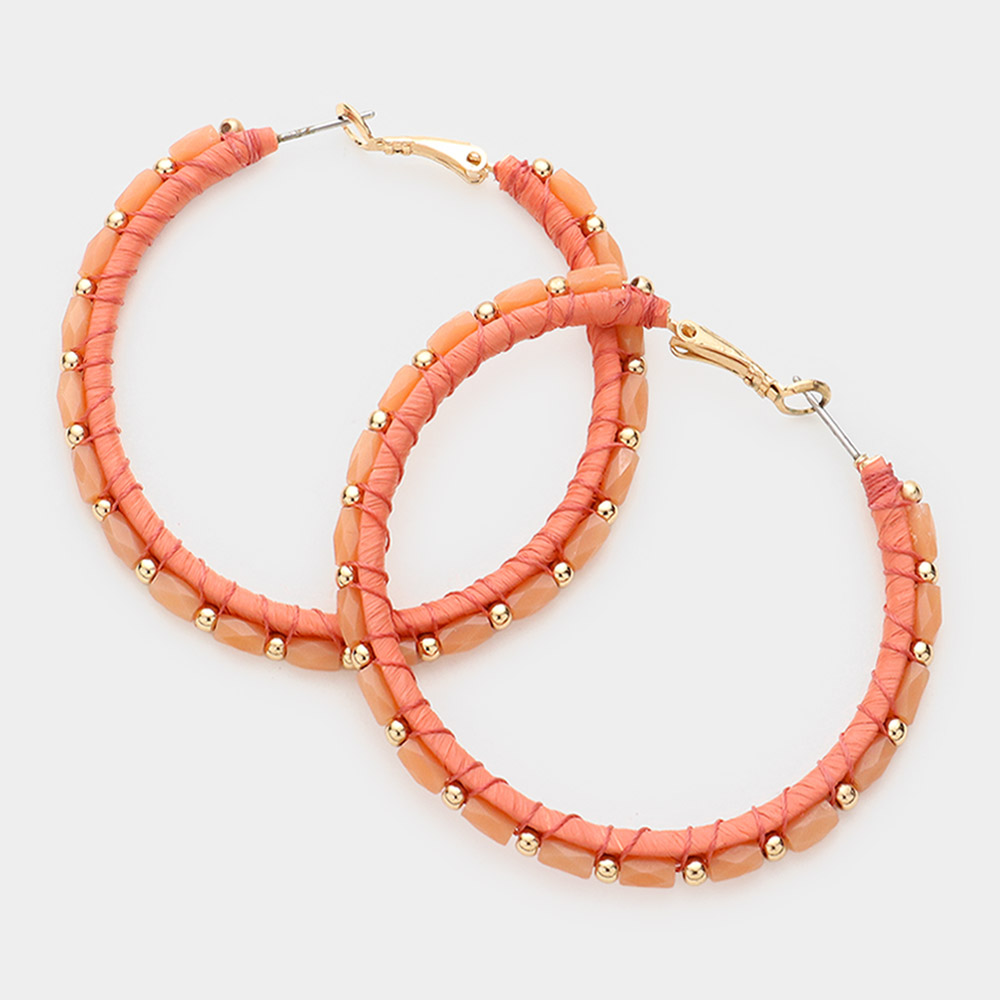Metal Ball Rectangle Bead Trimmed Raffia Wrapped Hoop Earrings