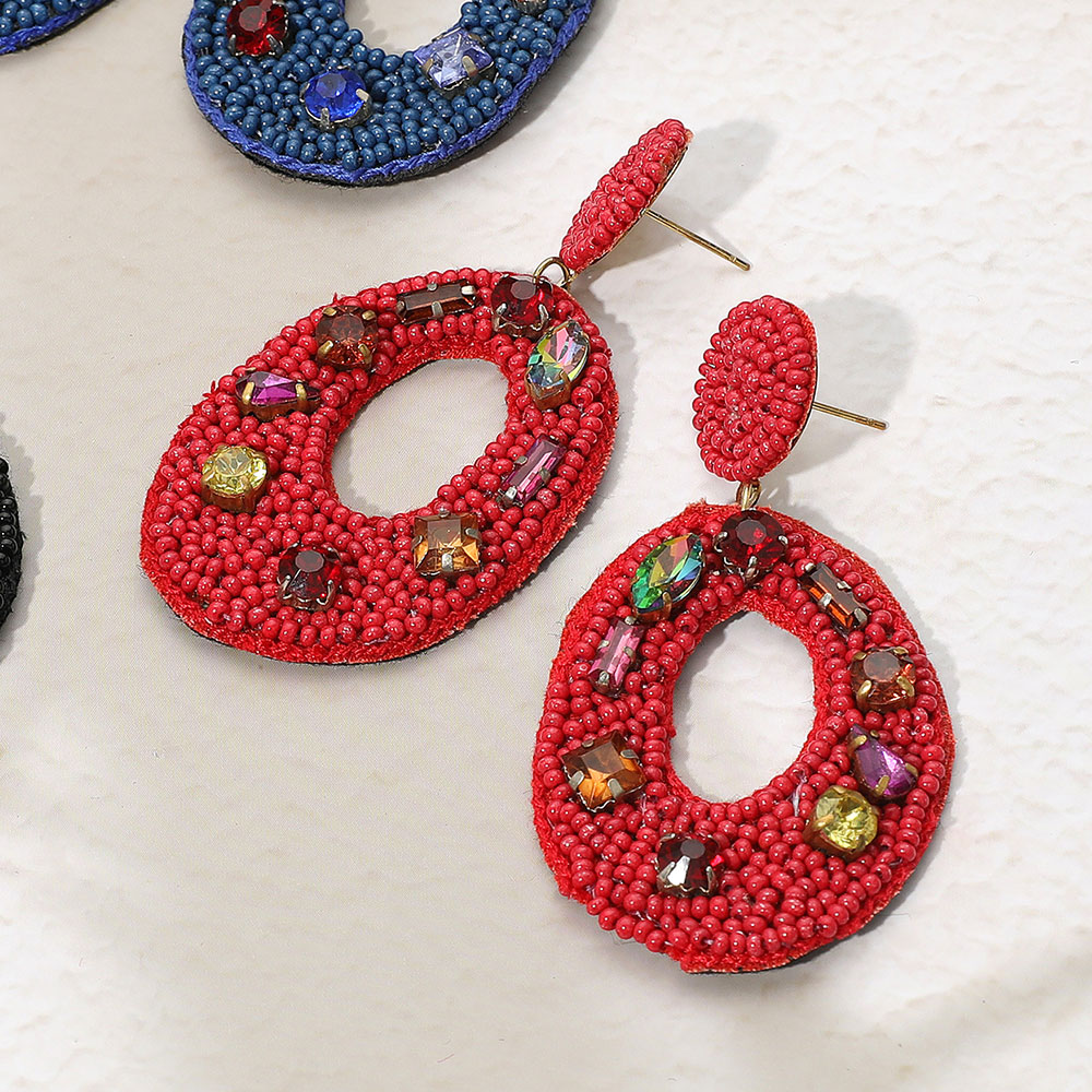 Multi Stone Embellished Seed Beaded Cutout Oval Dangle Earrings