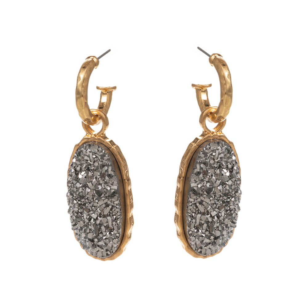 3Pairs - Brass Metal Round Stone Druzy Heptagon Hoop Earring Set