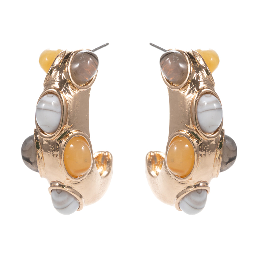 • These chunky hoop earrings feature a sculpted curved silhouette accented with smooth cabochon-style details for a bold statement look. Designed to stand out with dimensional texture and shine, they add personality to everyday outfits or styled ensembles. A standout accessory perfect for fashion-forward collections, gifting, or elevating casual and dress-ready looks with modern flair.