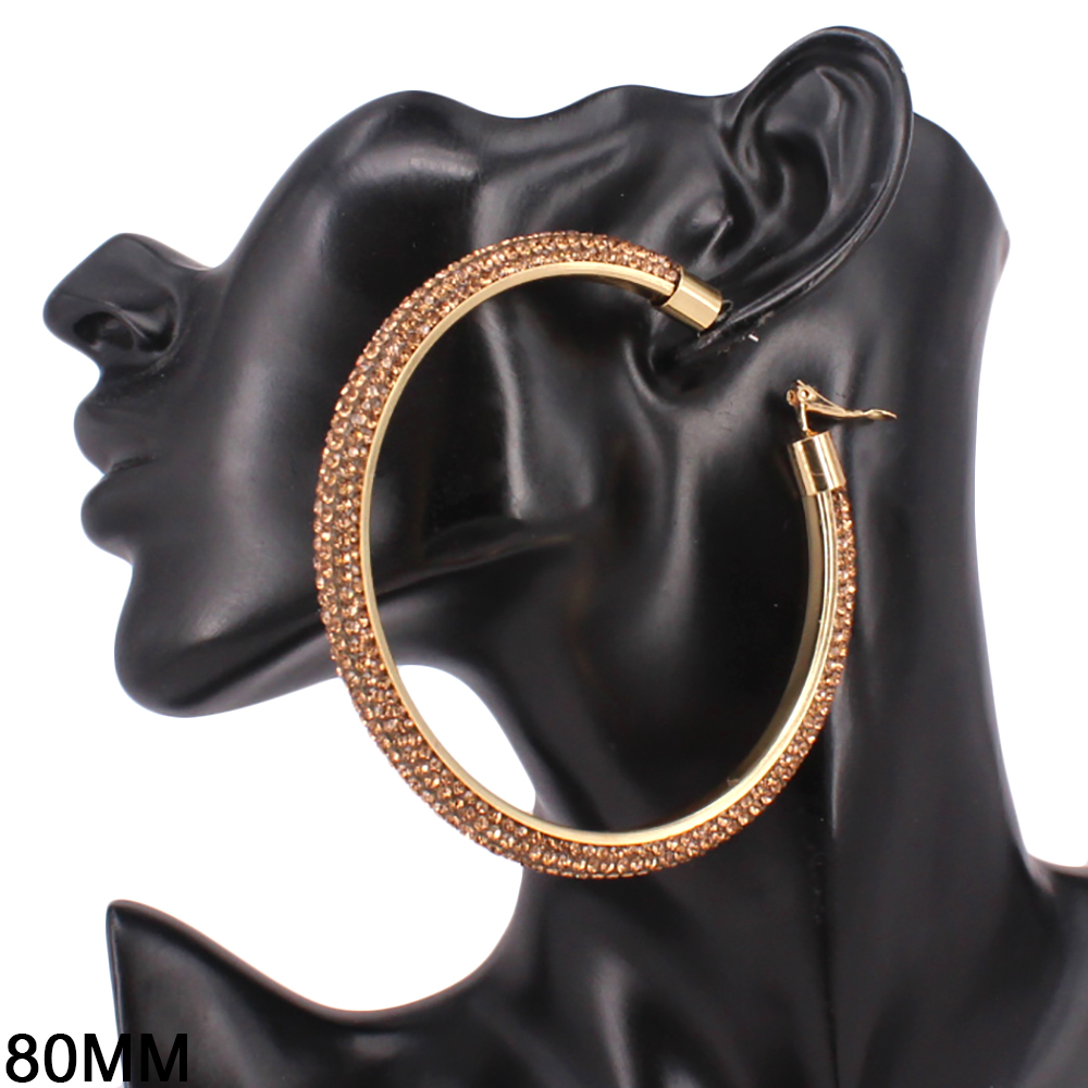 • Statement hoop earrings designed with a sleek curved silhouette and fully embellished surface for maximum shine. The bold 80mm size creates instant impact while remaining lightweight and comfortable for extended wear. Ideal for parties, festivals, night events, and trend-forward jewelry collections.