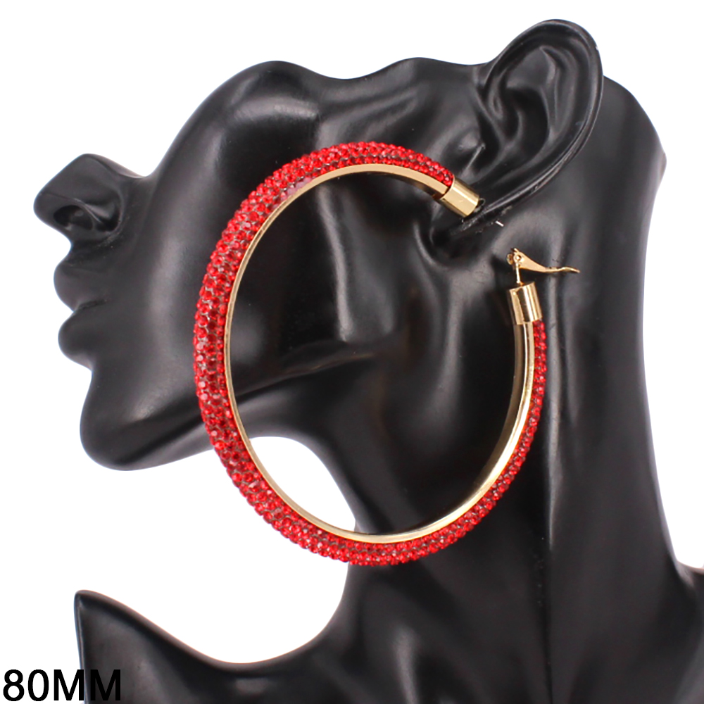 • Statement hoop earrings designed with a sleek curved silhouette and fully embellished surface for maximum shine. The bold 80mm size creates instant impact while remaining lightweight and comfortable for extended wear. Ideal for parties, festivals, night events, and trend-forward jewelry collections.