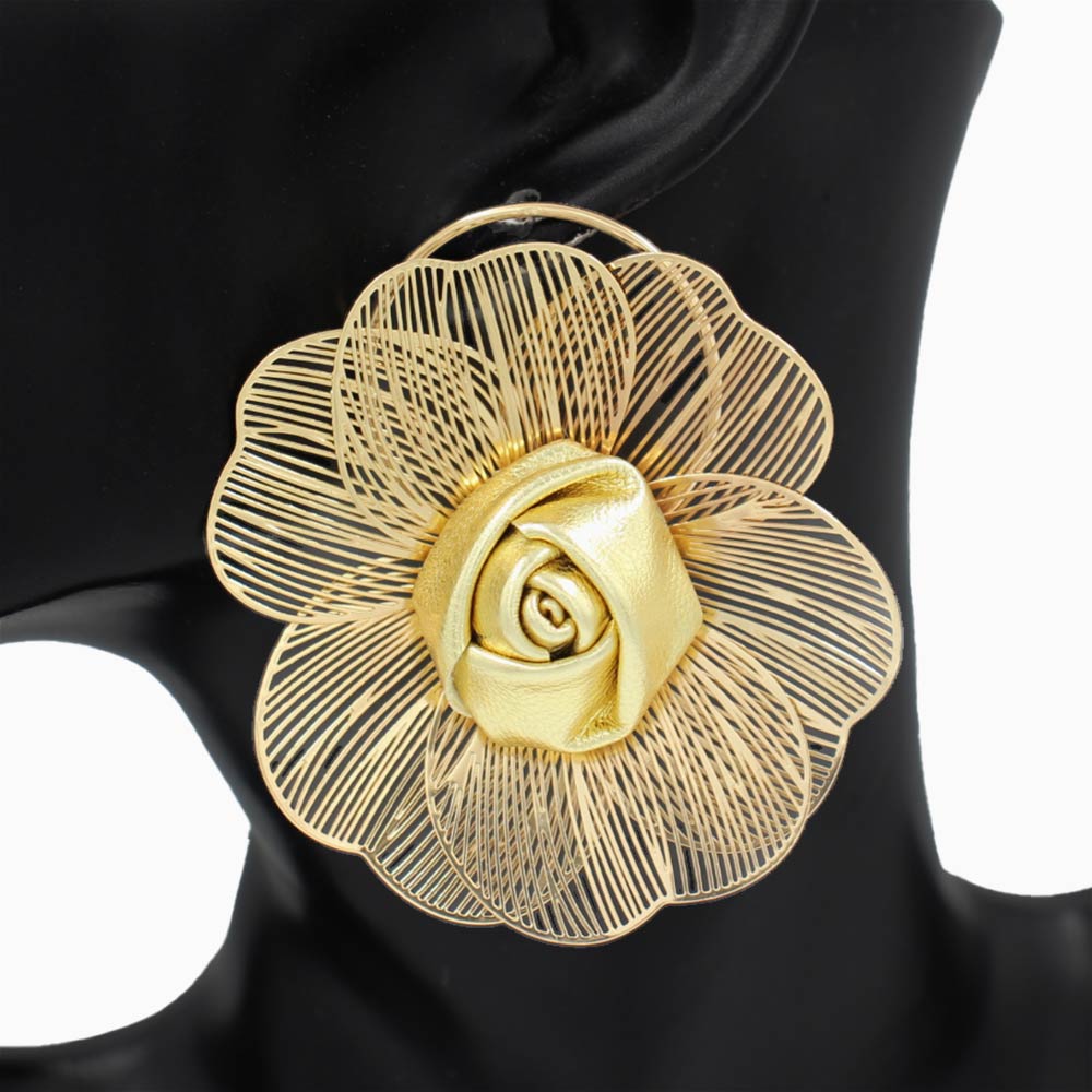 Details • Size : 2.5" X 2.75" • Post Back • Dramatic oversized floral stud earring featuring layered petal detailing and an eye-catching sculptural design. This bold statement piece delivers elegant impact and artistic texture, making it ideal for boutiques seeking standout accessories for elevated everyday or special occasion styling. • Lead and Nickel Compliant