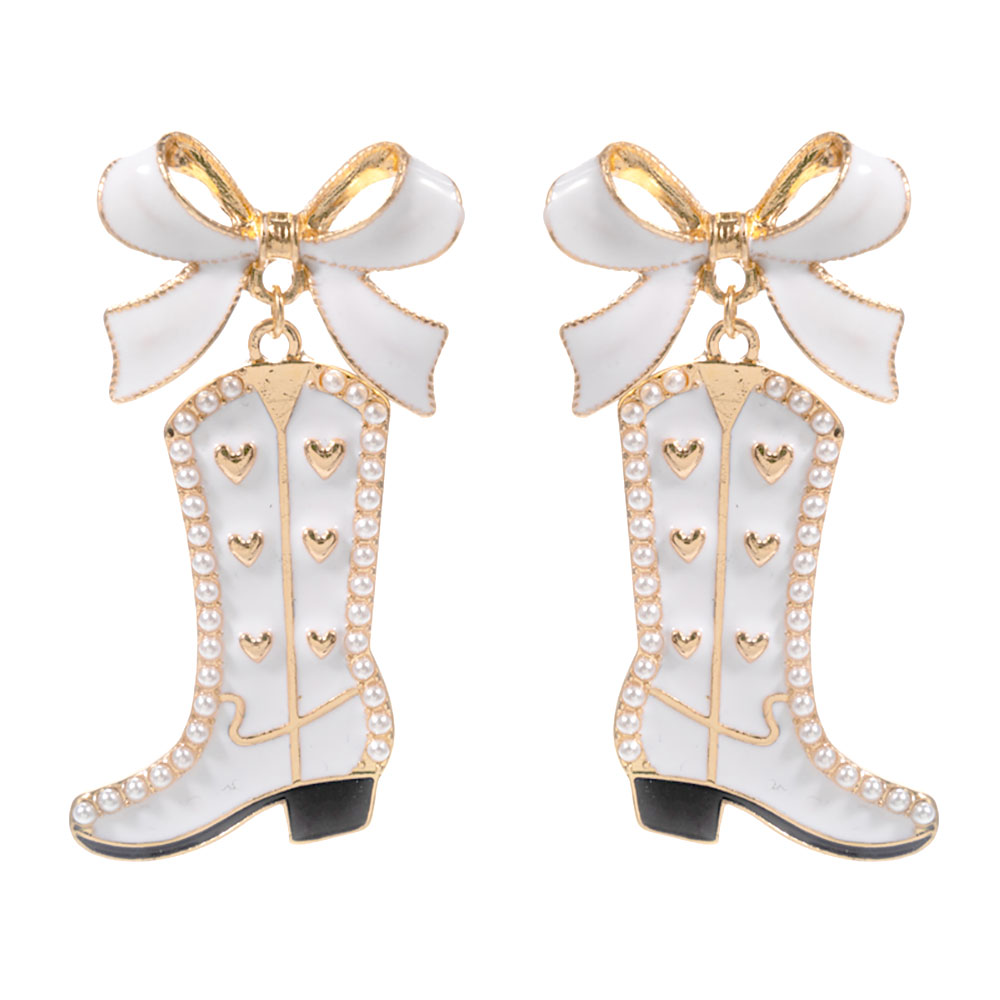 Details • Size : 1" X 1.8" • Titanium Post Back • Playful bride-themed statement earrings featuring a western boot charm with bow detail and heart accents. Perfect for bachelorette parties, bridal showers, western weddings, engagement photos, and themed celebrations. A fun accessory that adds personality to bridal outfits, party looks, and curated gift selections. • Hypoallergenic • Lead and Nickel Compliant