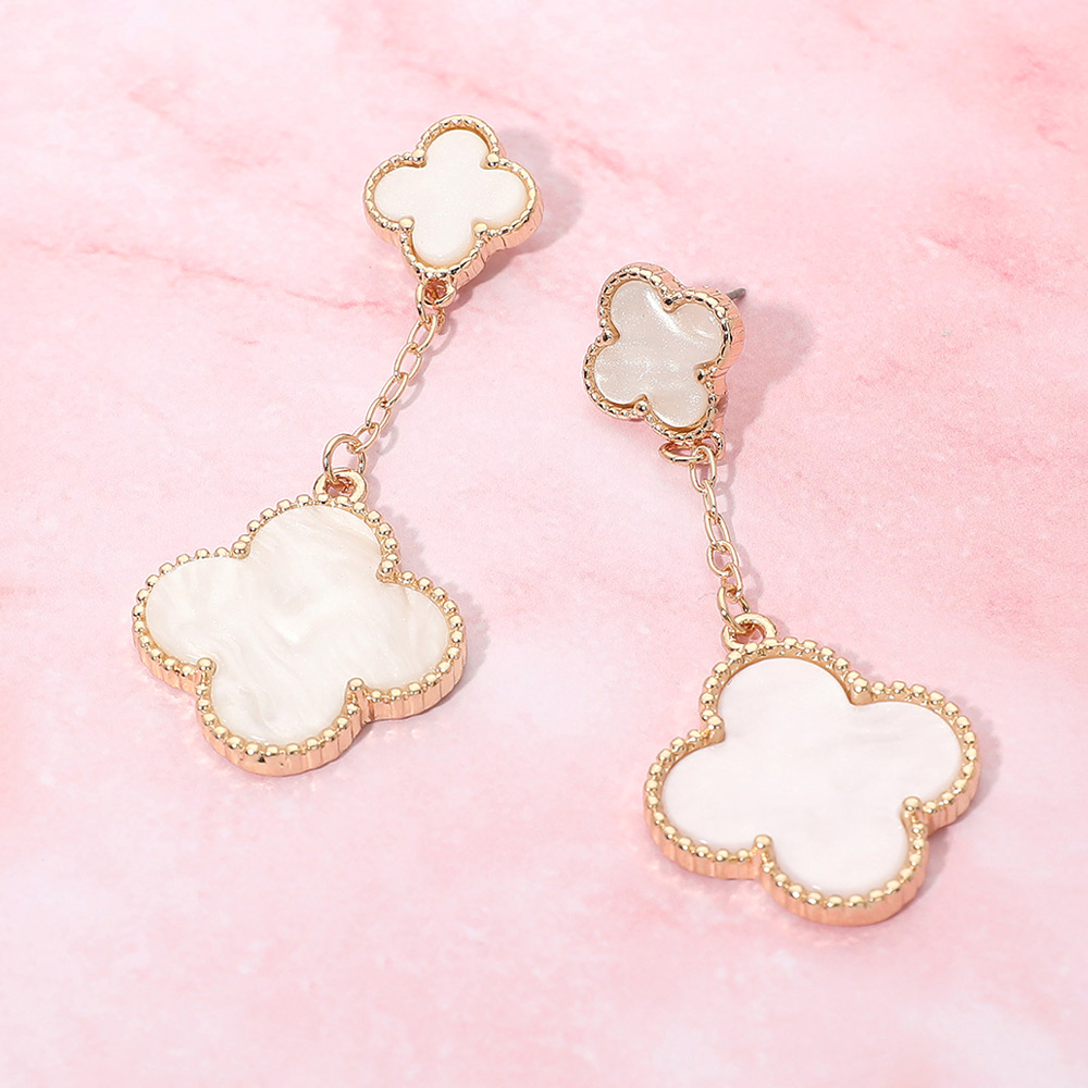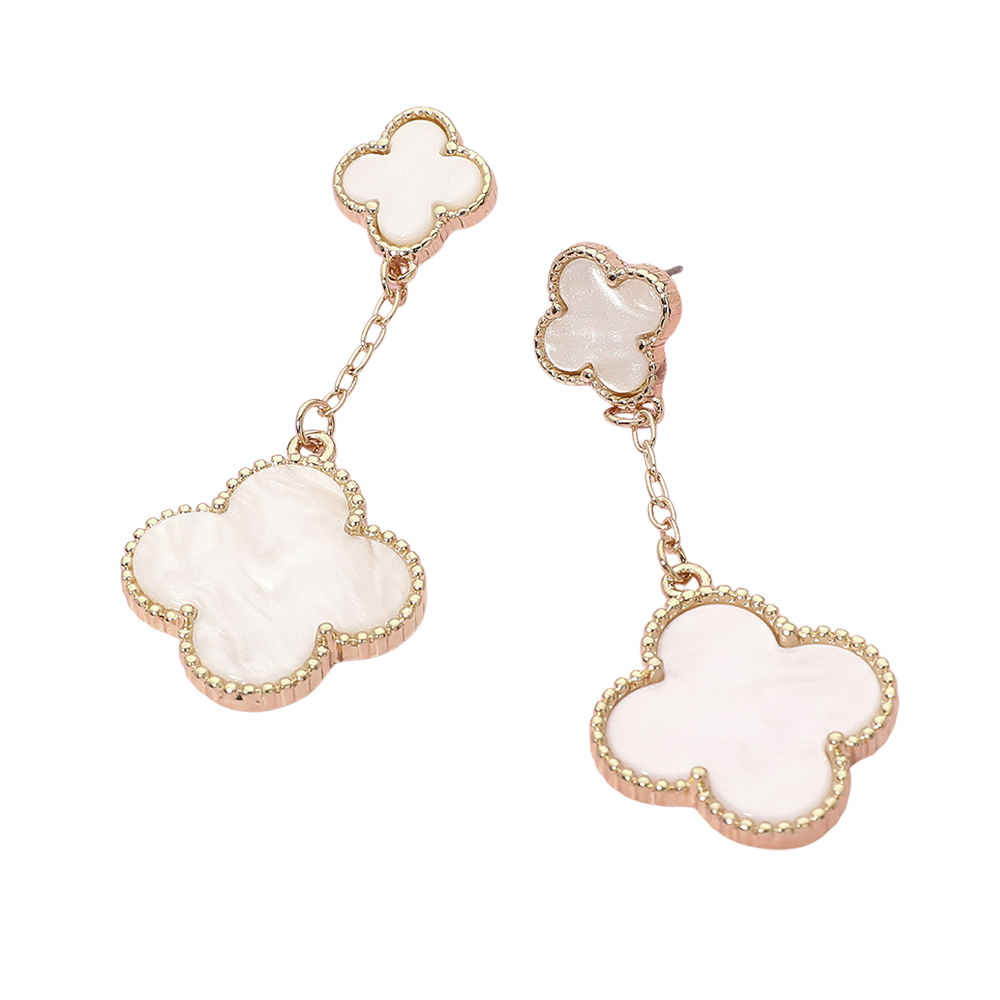 Details • Size : 1" X 2.6" • Post Back • Stylish chain drop earrings featuring layered quatrefoil charms for a soft, elegant look with gentle movement. This timeless silhouette adds refined detail to everyday outfits and special occasion styling, making it a versatile choice for boutiques, gift assortments, and curated jewelry collections seeking modern yet classic appeal. • Lead and Nickel Compliant