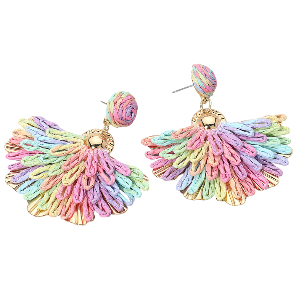 Details • Size : 2.25" X 2.6" • Post Back • These fan fringe statement drop earrings feature layered woven-inspired detailing and dramatic movement for eye-catching style. Designed to elevate boutique assortments, they add bold texture and dimension, making them ideal for resort looks, summer outfits, festivals, special occasions, and fashion-forward everyday accessorizing. • Lead and Nickel Compliant