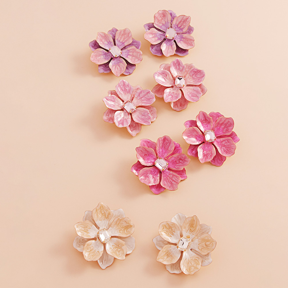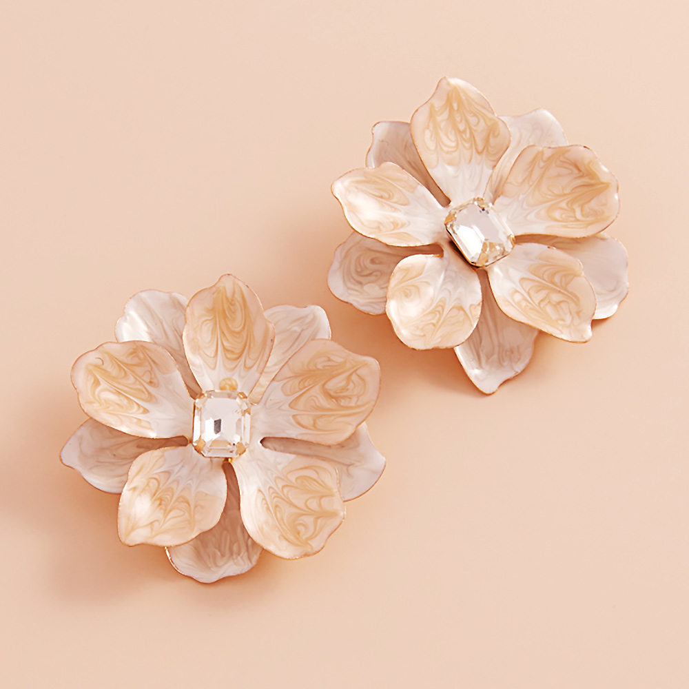 Rectangle Stone Centered Pearlized Enamel Flower Earrings