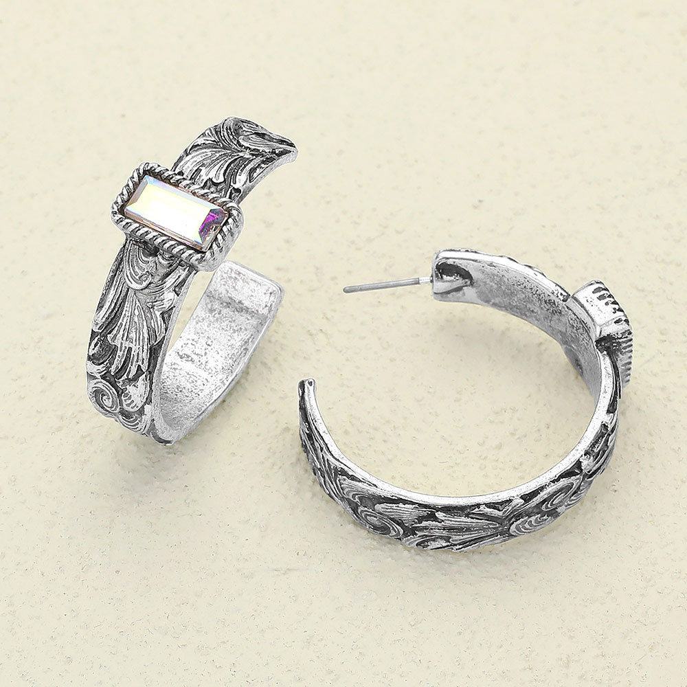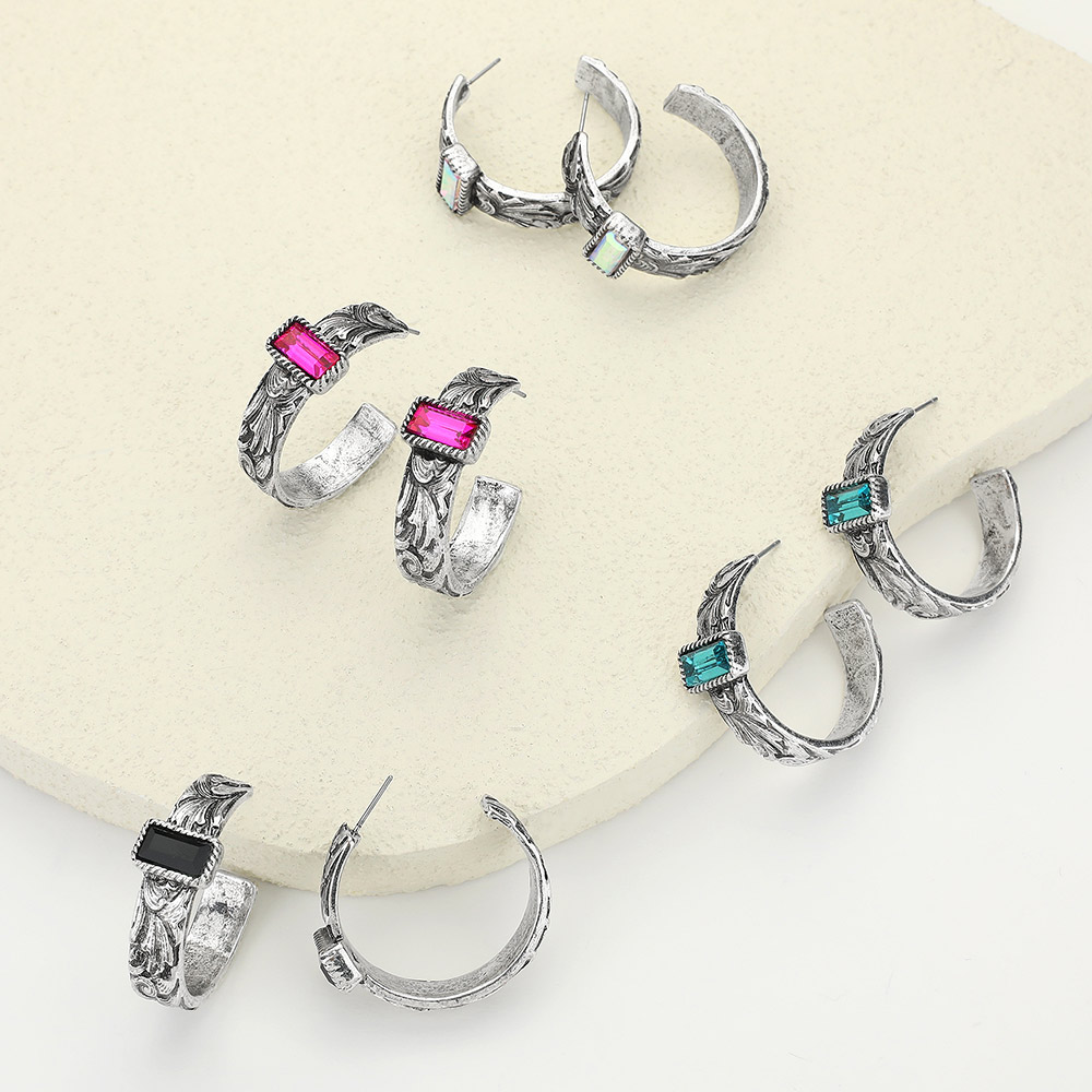 Rectangle Stone Pointed Antique Metal Western Hoop Earrings