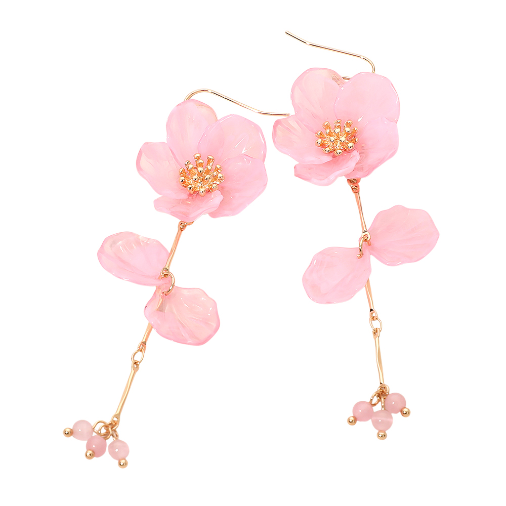 Details • Size : 1.25" X 3.75" • Fish Hook Back • Elegant long drop earrings featuring layered floral petals and delicate clustered accents for a soft, romantic look. Perfect for weddings, parties, garden events or adding graceful botanical charm to everyday style with their airy, feminine movement. • Lead and Nickel Compliant