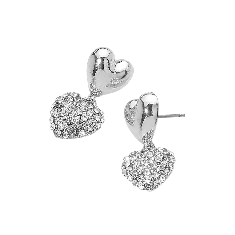 • Add a touch of romance with these sparkling double heart earrings, featuring a sleek metallic top heart and a dazzling crystal-accented lower heart. Perfect for day-to-night wear, they bring elegant charm and a playful shimmer to your style effortlessly.