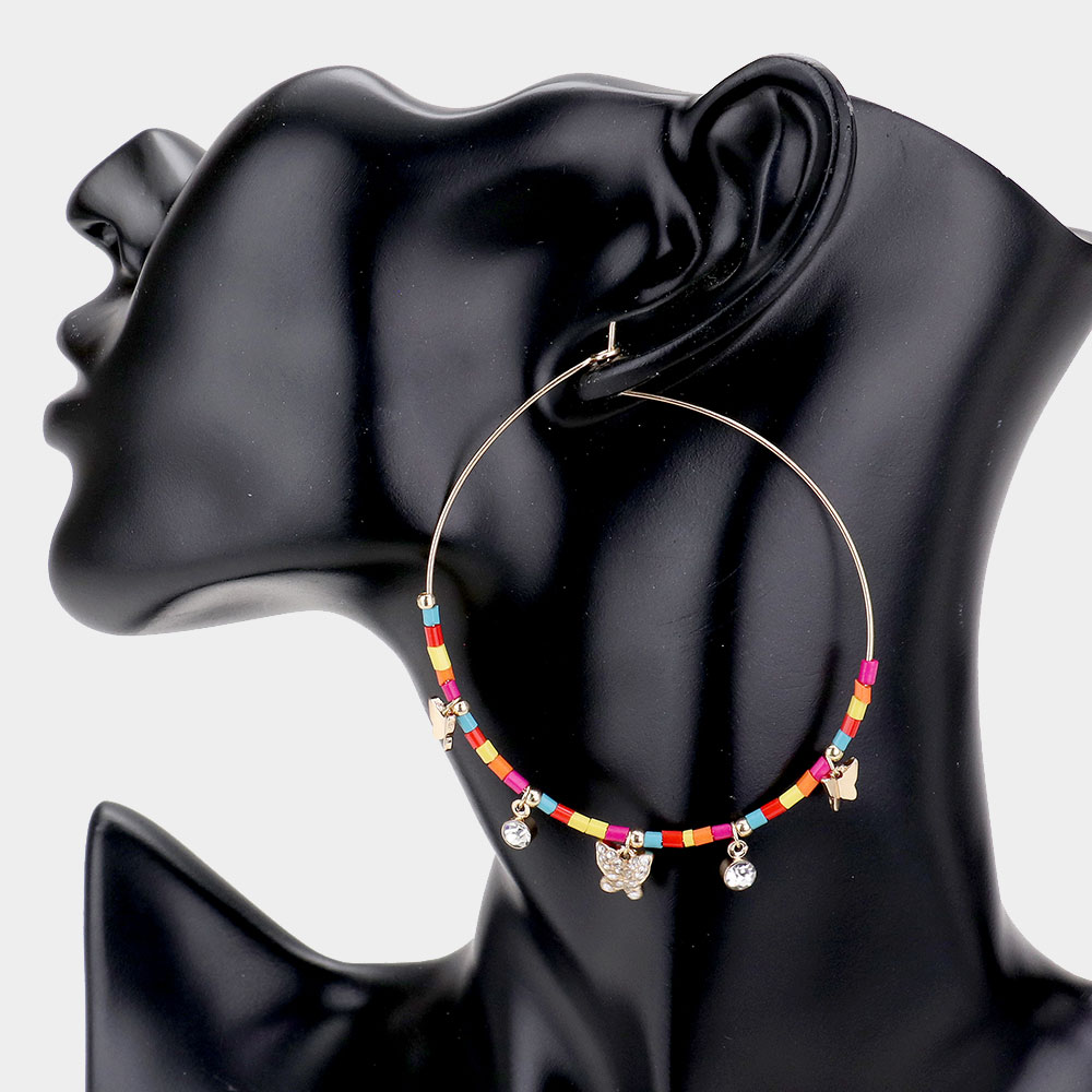 Rhinestone Embellished Metal Butterfly Beaded Open Circle Earrings