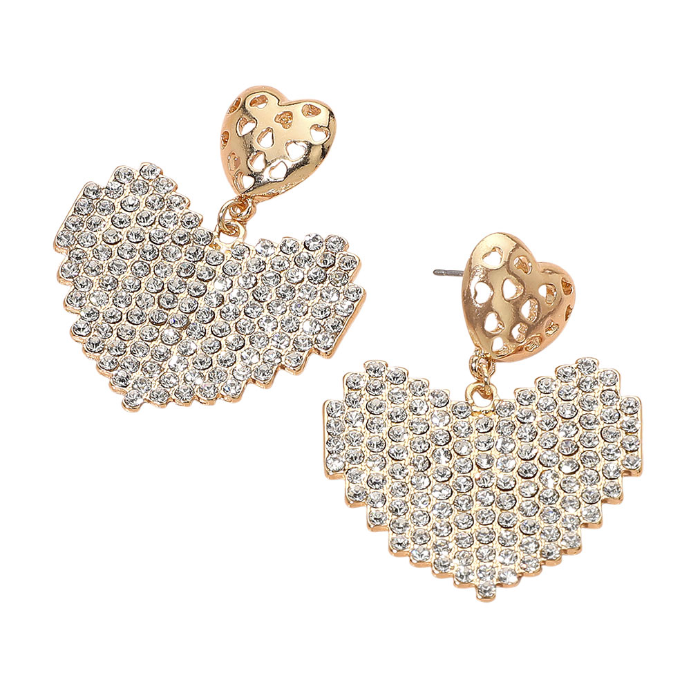 • Eye-catching heart drop earrings featuring a cutout upper heart and a radiant crystal pavĂ© lower heart in a bold layered silhouette. A perfect statement accessory for parties, gifting, or elevating everyday outfits with sparkle and charm.