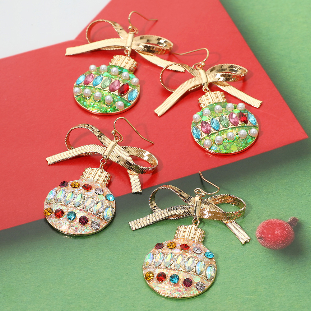 Details • Size : 1.6" X 2.3' • Fish Hook Back • Celebrate the season in style with these festive ornament drop earrings featuring colorful gemstones, pearl accents, and elegant gold-tone bows. Perfect for holiday parties, gatherings, or gifting, these cheerful earrings add sparkle and festive charm to any outfit. • Lead and Nickel Compliant
