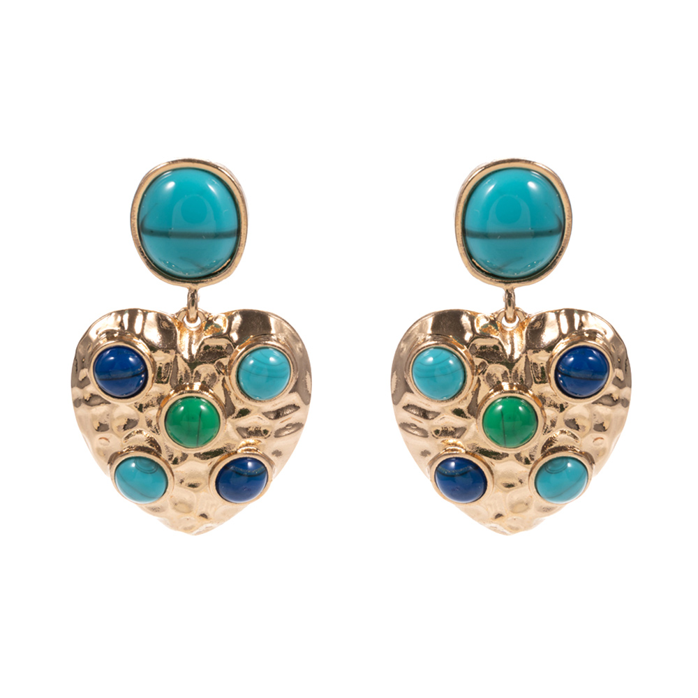 Round Stone Embellished Textured Metal Heart Dangle Earrings Round Stone Embellished Textured Metal Heart Dangle Earrings