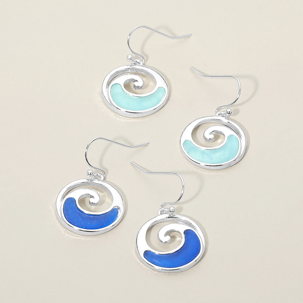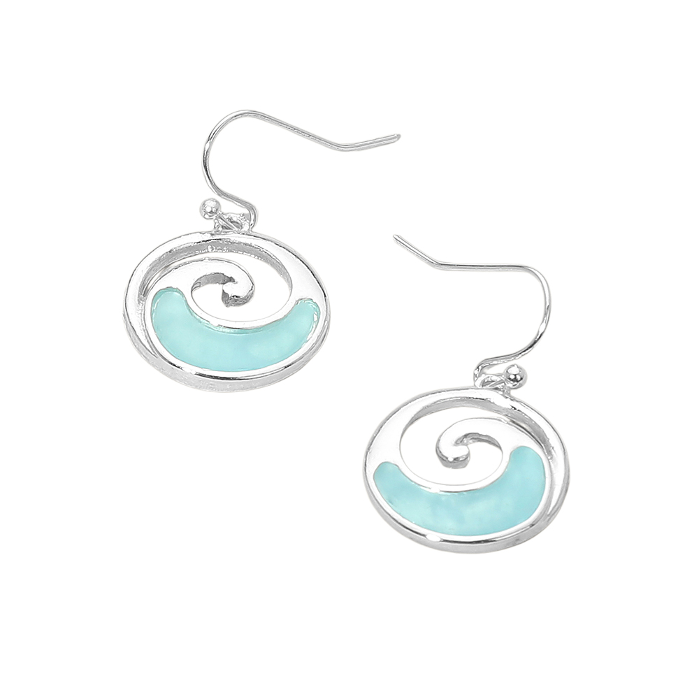 Details • Size : 0.75" X 1.2" • Fish Hook Back • Stylish ocean-inspired dangle earrings featuring a graceful swirl wave design in a circular silhouette. Lightweight with fluid movement, these earrings bring a coastal, beach-ready feel to everyday outfits, vacation looks, resort wear collections, and giftable accessory assortments for boutiques. • Lead and Nickel Compliant