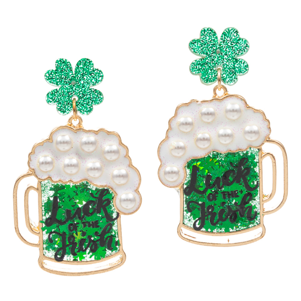 • These festive drop earrings feature a playful beer mug design with shamrock accents and a fun “Luck of the Irish” message for a bold seasonal statement. Lightweight with eye-catching movement, they are perfect for St. Patrick’s Day celebrations, themed parties, gifting, or adding cheerful personality to holiday outfits and novelty jewelry collections.