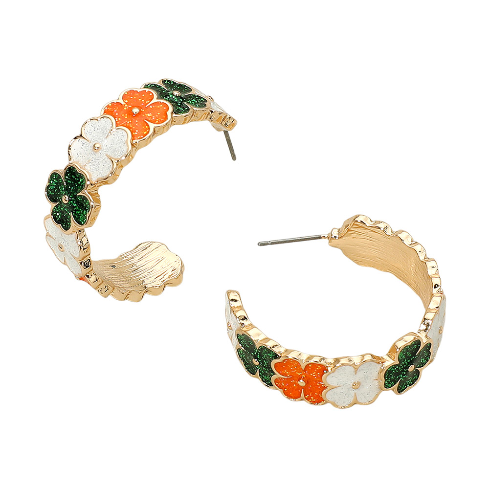 • Festive clover hoop earrings designed for St. Patrick’s Day, featuring layered shamrock details that wrap the hoop for a bold seasonal look. Perfect for holiday celebrations, parades, themed outfits, gifting, and retail displays that highlight lucky symbols and playful charm.