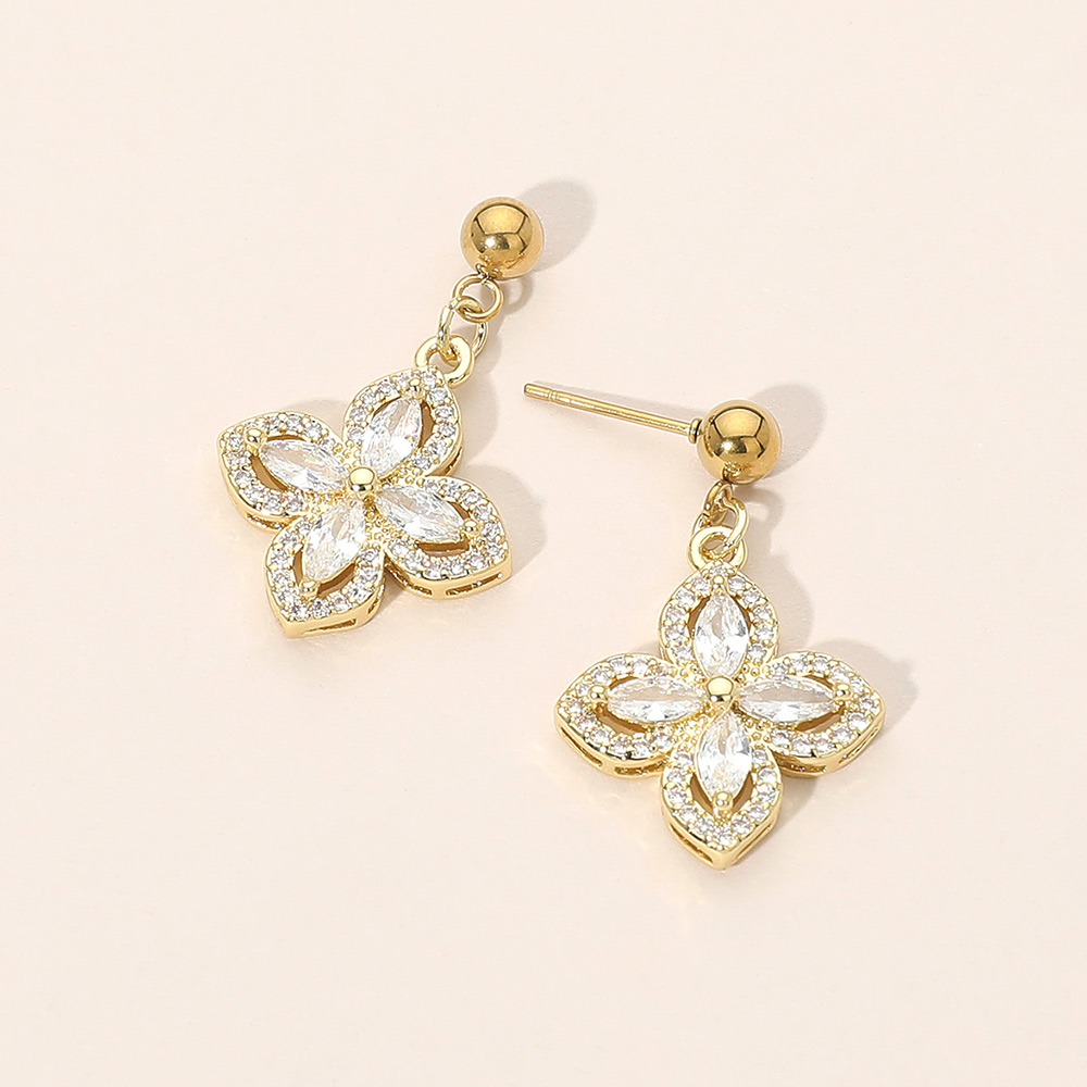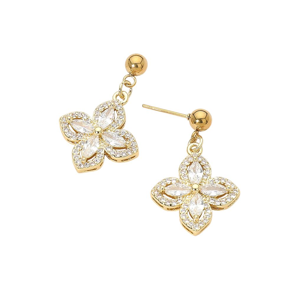 Details • Size : 0.75" X 1.25" • Post Back • Elegant floral cz drop earrings featuring a layered petal design with shimmering accents that add graceful movement and refined shine. Designed to elevate everyday outfits and special occasion looks, these earrings are a versatile choice for boutiques, gifting, and customers seeking timeless, feminine jewelry. • CZ Cubic Zirconia • Stainless Steel