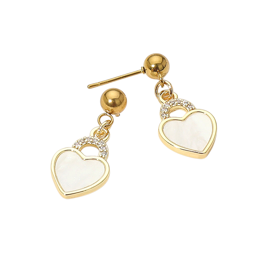 Stainless Steel CZ Stone Accent Mother of Pearl Heart Charm Dangle Earrings