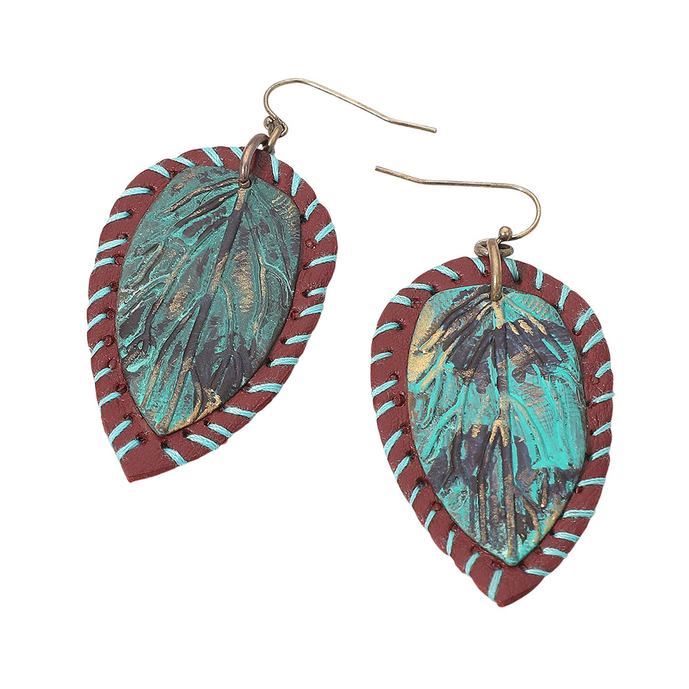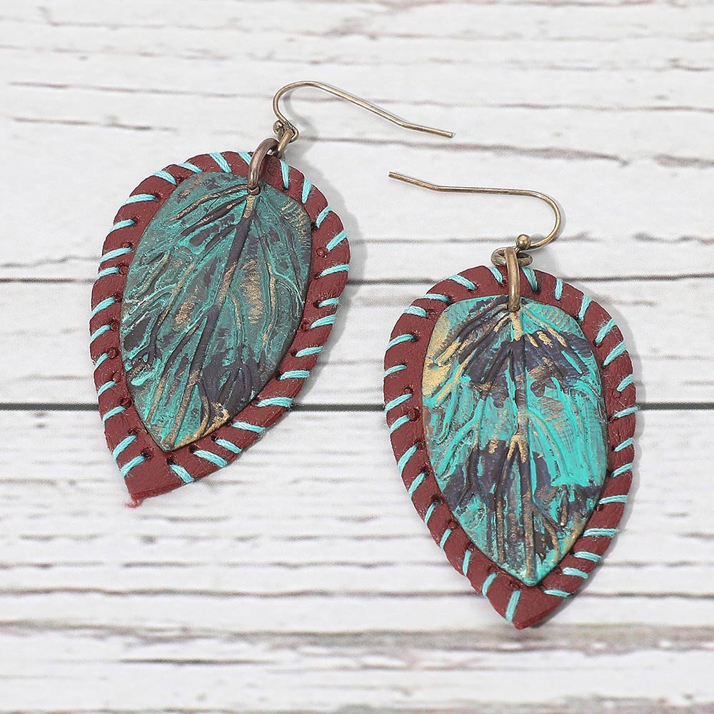 Stitched Faux Leather Layered Metal Leaf Dangle Earrings Stitched Faux Leather Layered Metal Leaf Dangle Earrings