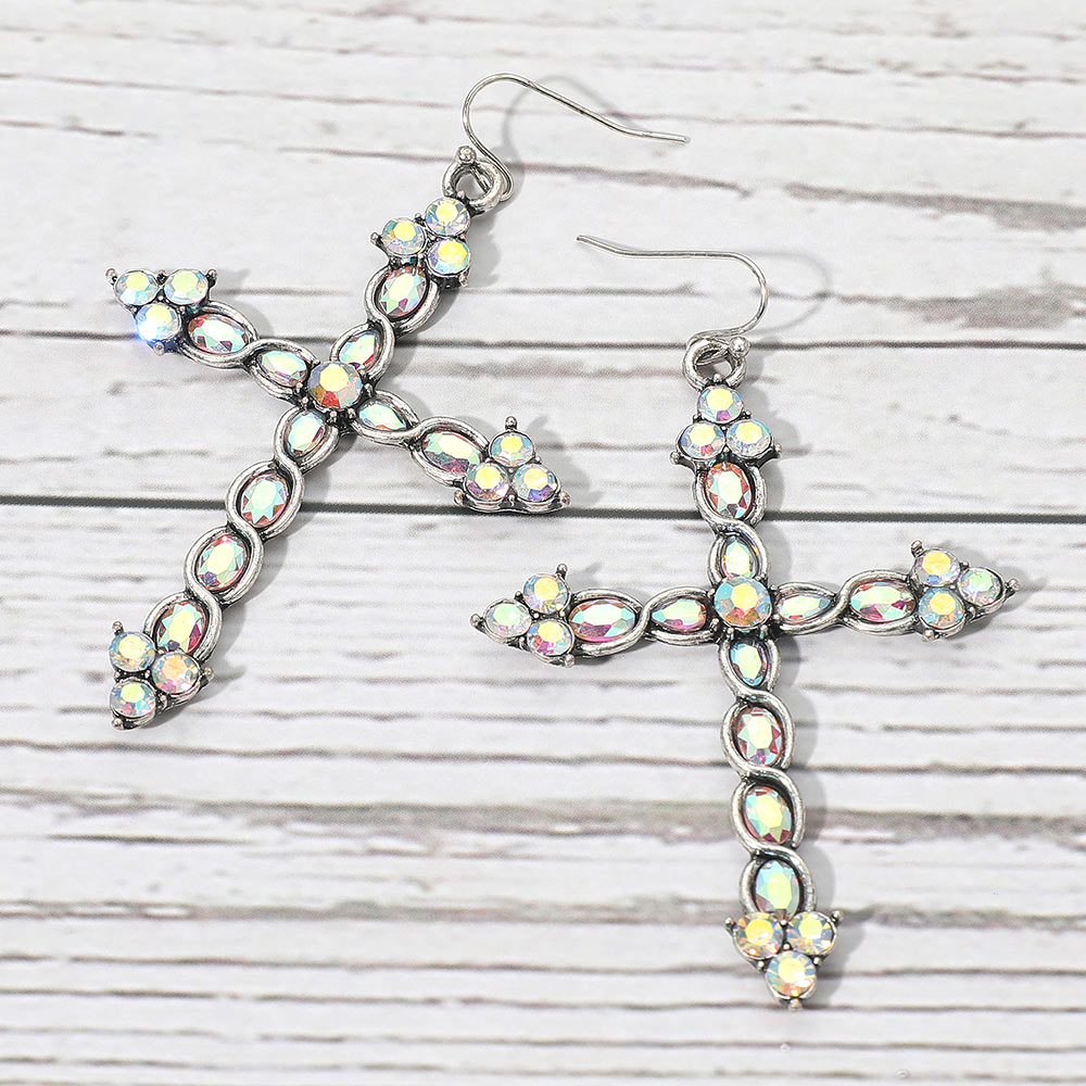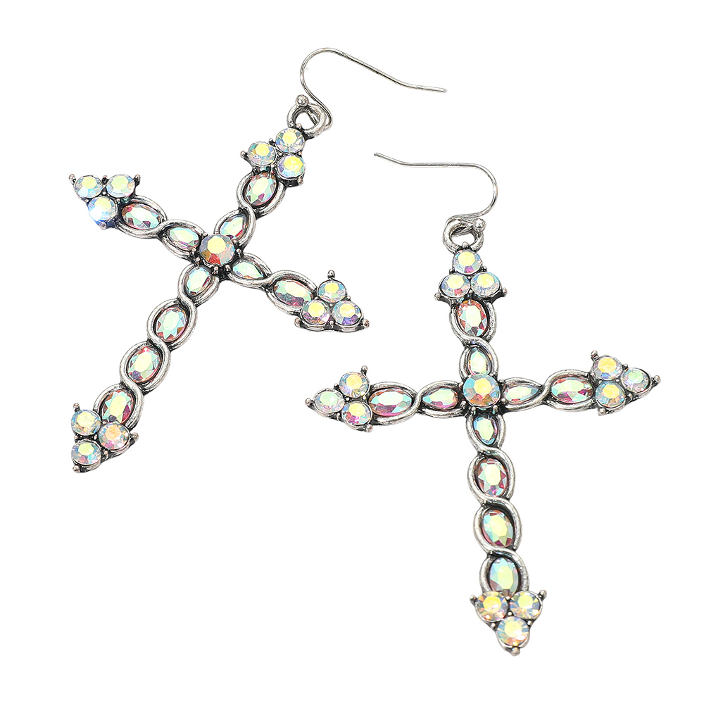 Details • Size : 2" X 3.1" • Fish Hook Back • Statement cross drop earrings adorned with sparkling accents arranged in an elegant pattern, perfect for adding a bold and expressive touch to any look. Ideal for those who love eye-catching accessories with a blend of classic shape and modern flair. • Lead and Nickel Compliant