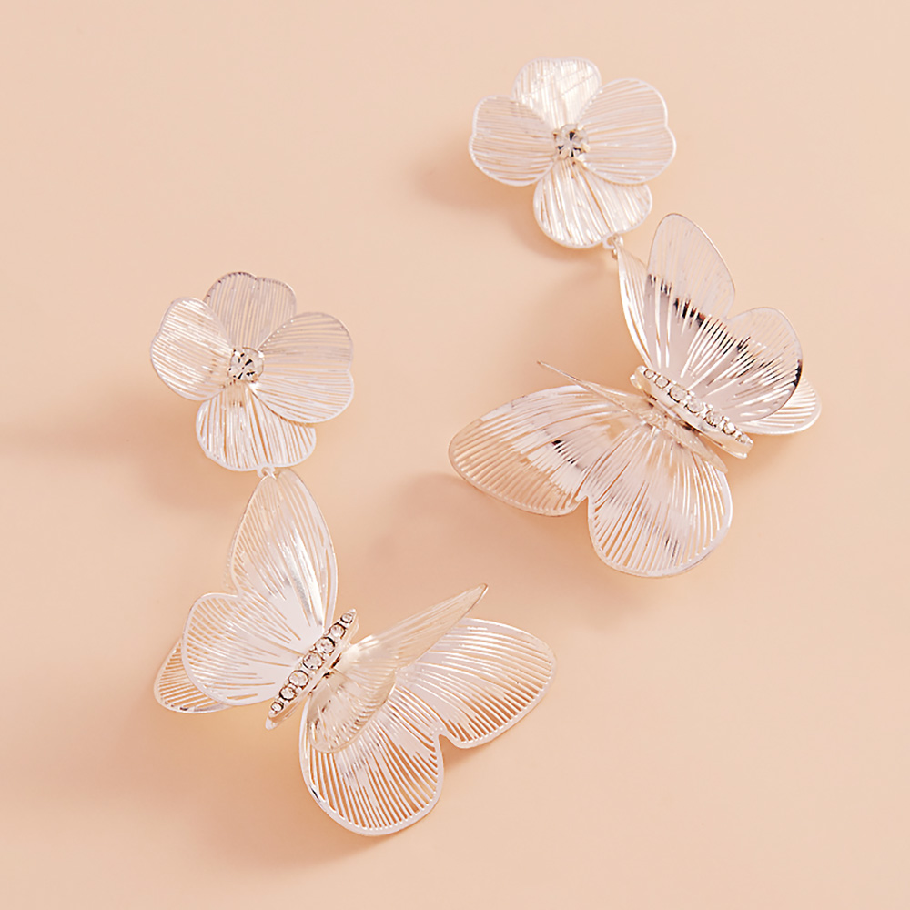 Stone Pointed Metal Filigree Flower Butterfly Dangle Earrings
