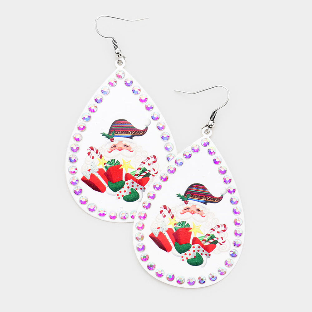 Stone Trim Santa Claus Xmas Gift Serape Print Metal Teardrop Dangle Earrings