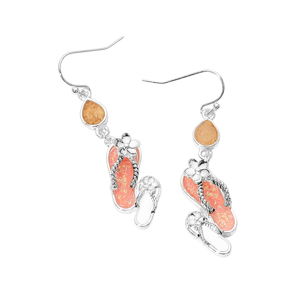 Details • Size : 0.5" X 2" • Fish Hook Back • Beach inspired flip flop charm drop earrings featuring playful movement and a relaxed coastal theme. A fun accessory for summer outfits, vacation looks, resort wear, and seaside gift assortments, adding personality and seasonal appeal while remaining lightweight and easy to style. • Lead and Nickel Compliant