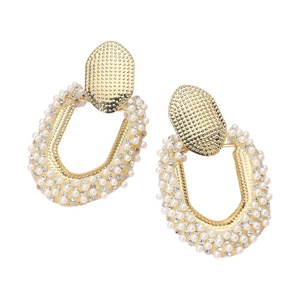 Details • Size : 1.5" X 2.7" • Post Back • These textured pearl accent drop earrings combine intricate detailing with elegant curves for a refined, luxurious appeal. The shimmering bead embellishments add depth and sophistication, making them an exquisite choice for formal events or to elevate any stylish contemporary look. • Lead and Nickel Compliant