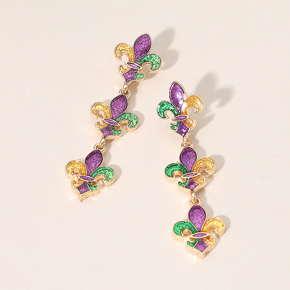 • These fleur de lis linked drop earrings showcase a bold stacked motif with graceful movement, creating a striking statement for festive looks and themed collections. Designed to stand out while remaining easy to wear, they are ideal for celebrations, parades, gifting displays, and boutique assortments seeking iconic symbolism and visual impact.