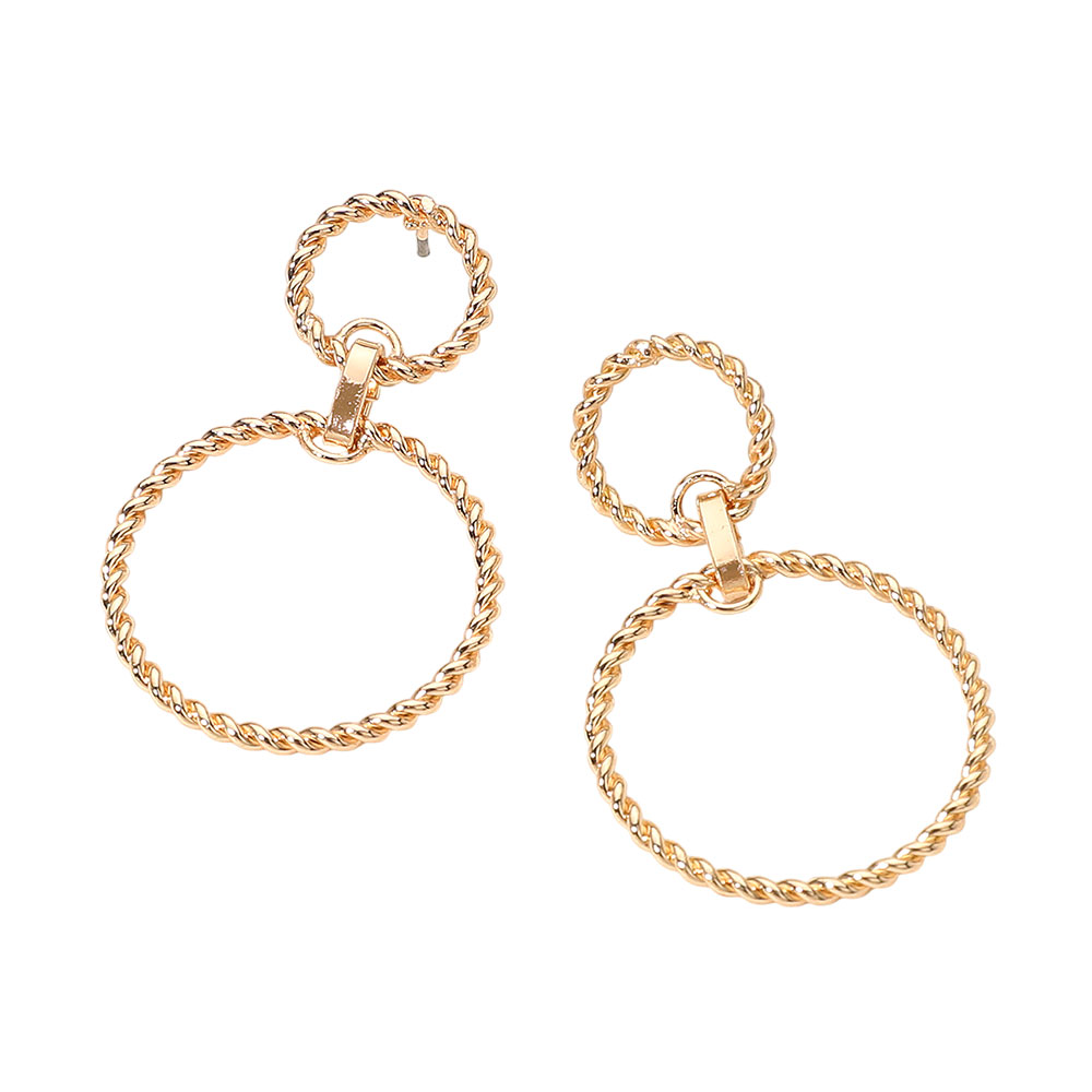 • These elegant double hoop earrings feature a twisted rope-inspired design, creating a chic and modern statement look. Perfect for both casual and formal occasions, they add a touch of sophistication and movement, making them an effortless accessory for any style ensemble.