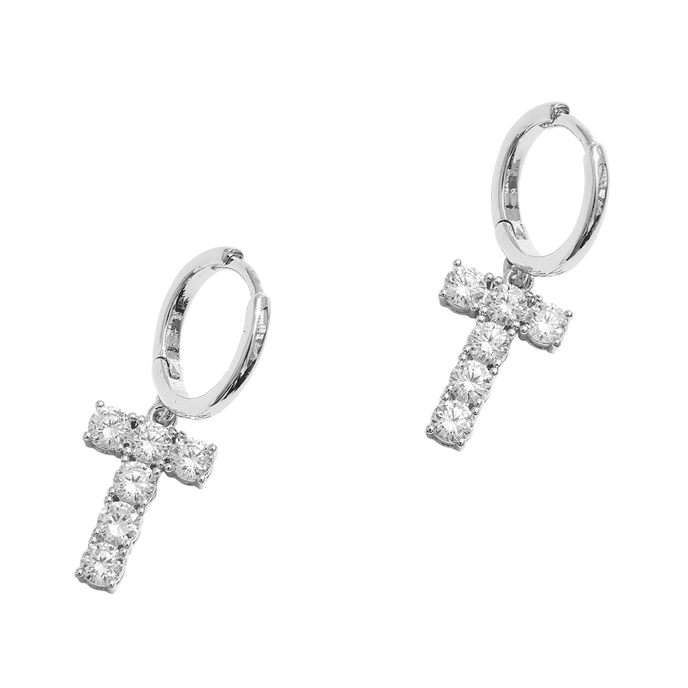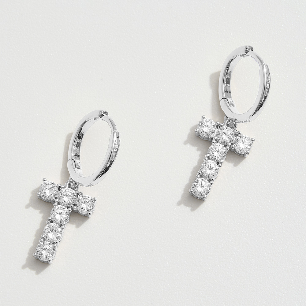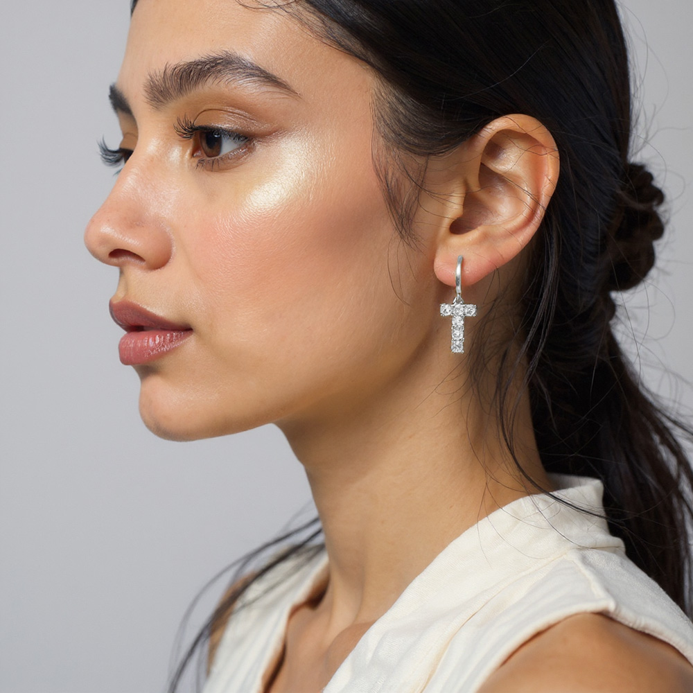 • These elegant hoop earrings showcase dazzling cubic zirconia stones arranged in a cross-shaped dangle, combining timeless symbolism with modern sophistication. Lightweight and versatile, they add a radiant touch to both casual and dressy outfits, making them a meaningful statement piece.