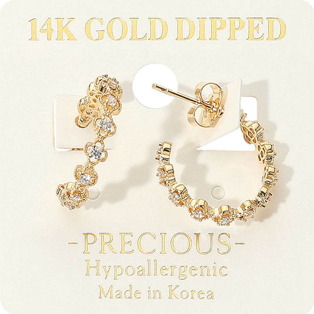 Details • Size : 0.75" X 0.8" • Post Back • Add delicate charm to your style with our floral crystal filigree hoop earrings. Crafted with intricate detailing, 14K gold-dipped, and hypoallergenic for everyday comfort. A statement accessory that complements both casual and formal looks. • Gold Dipped • Hypoallergenic • Made In Korea
