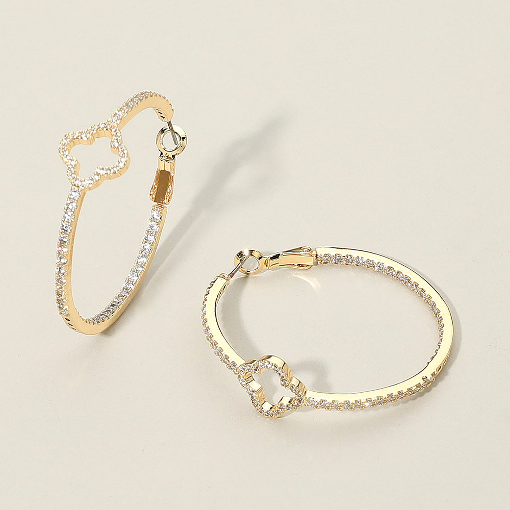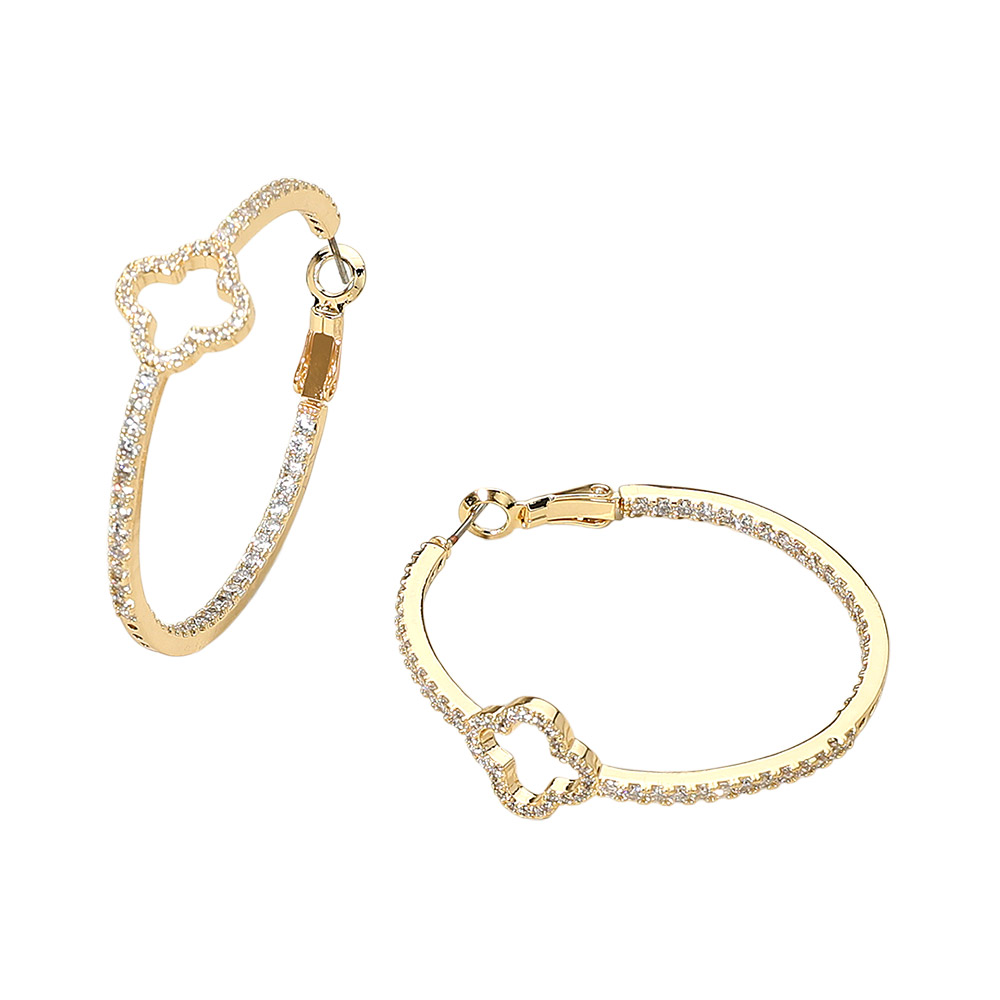 Details • Size : 1.6" X 1.6" X 0.5" • Omega Back • These elegant hoop earrings feature a delicate quatrefoil-shaped accent paired with a shimmering line of cz stones for added brilliance. Their refined silhouette offers a polished touch that enhances everyday outfits or special-occasion looks with effortless sophistication and charm. • CZ Cubic Zirconia • Gold Dipped
