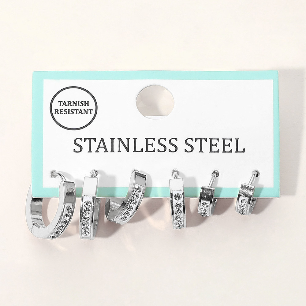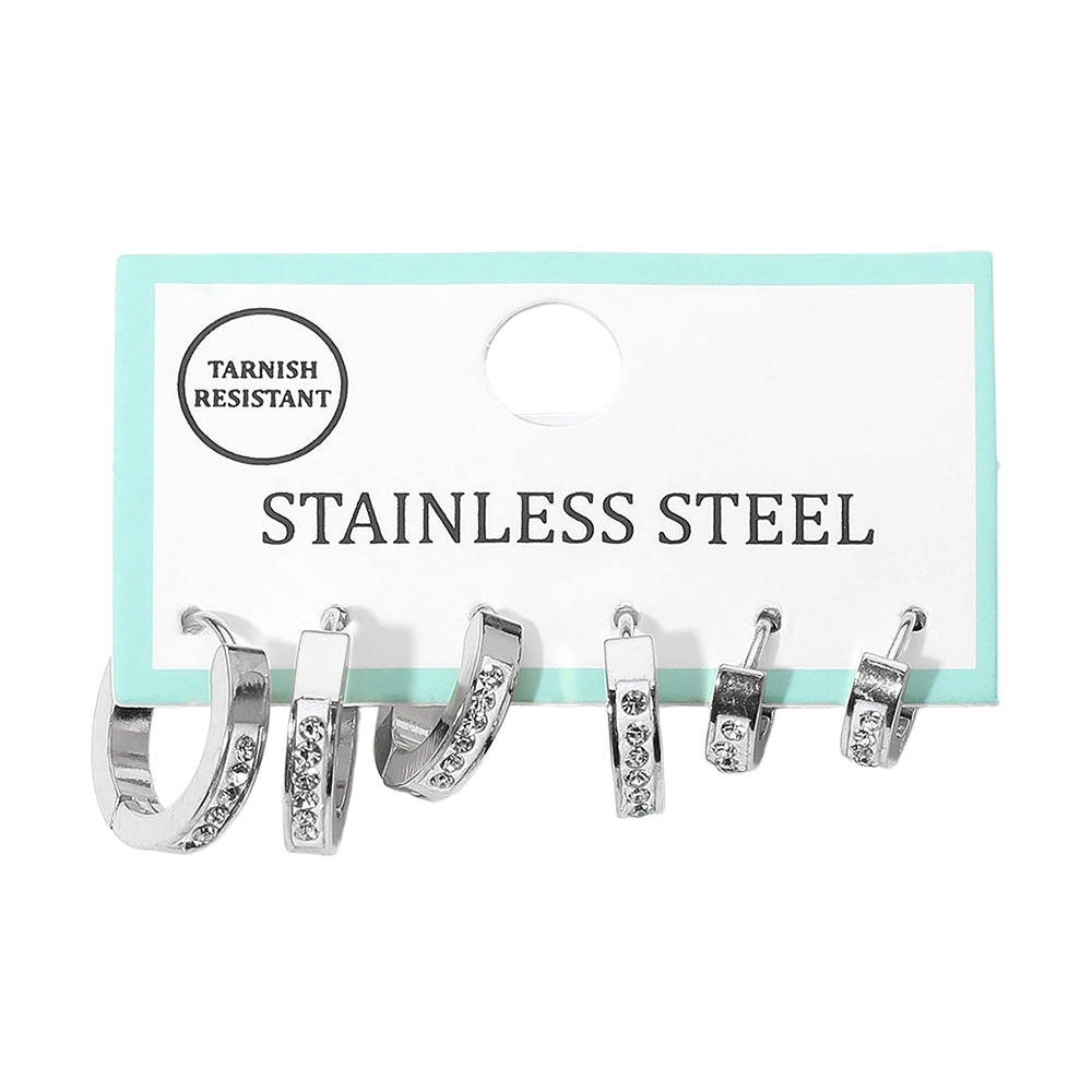3Pairs - Stainless Steel Stone Pave Bar Huggie Hoop Earring Set