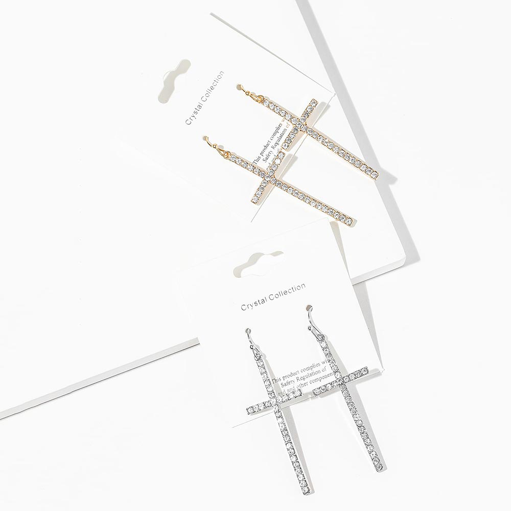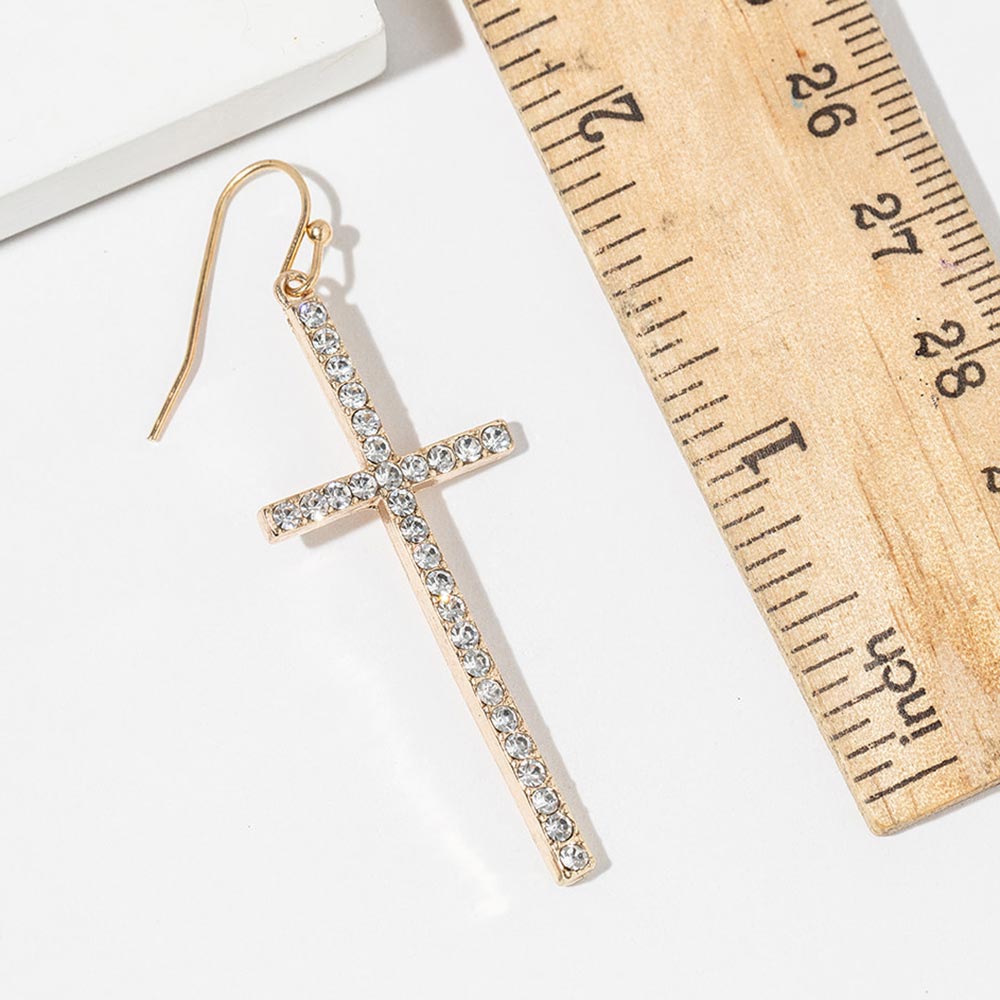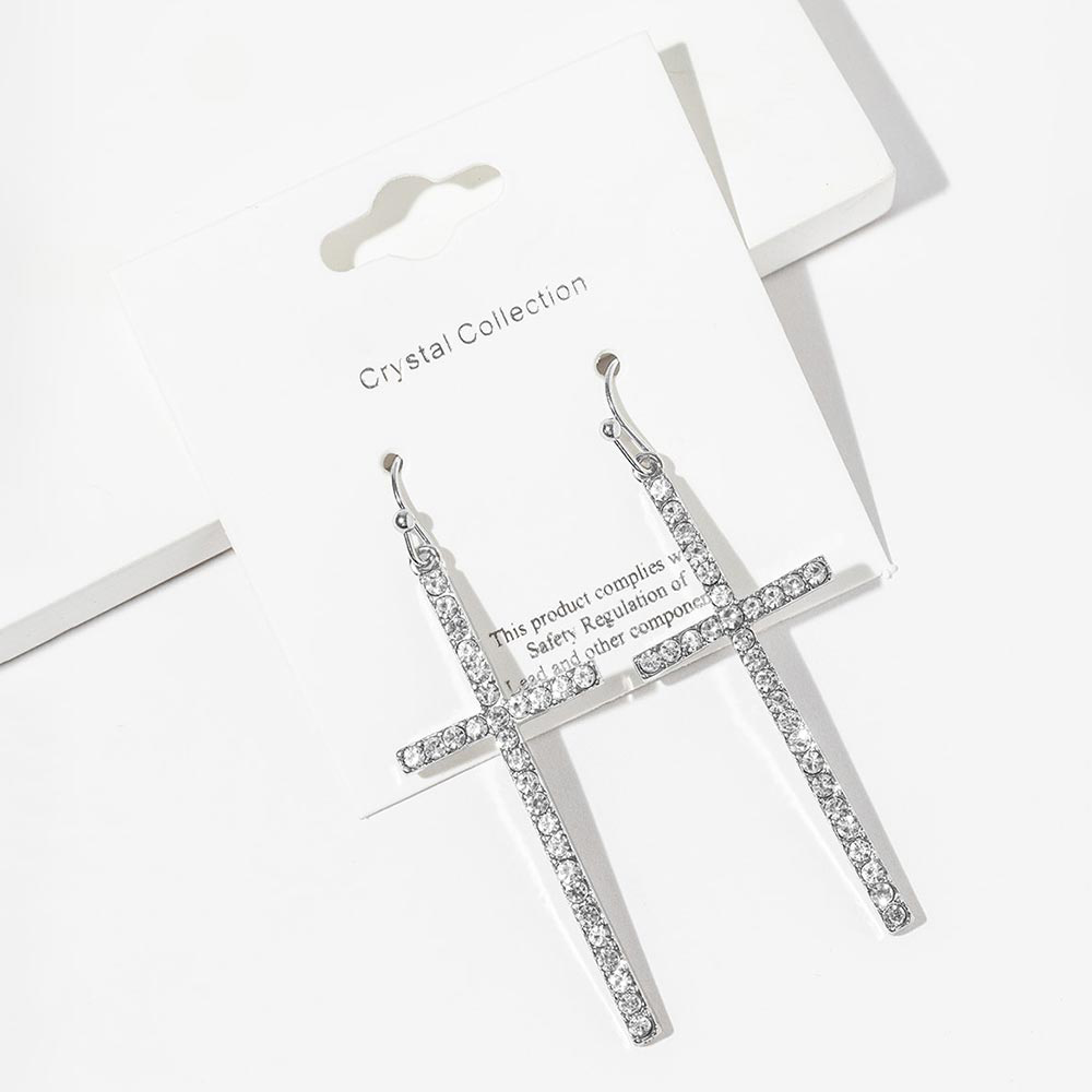 • Elegant cross drop earrings accented with shimmering pavĂ© stones for a refined statement. Designed with a sleek vertical silhouette that adds graceful movement and eye-catching sparkle. Perfect for everyday wear, evening looks, gifting, and faith-inspired accessory collections in modern boutiques.
