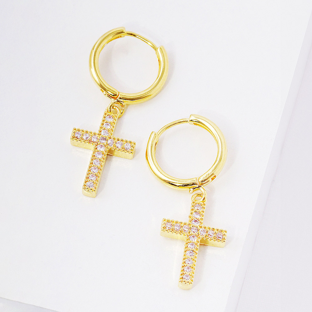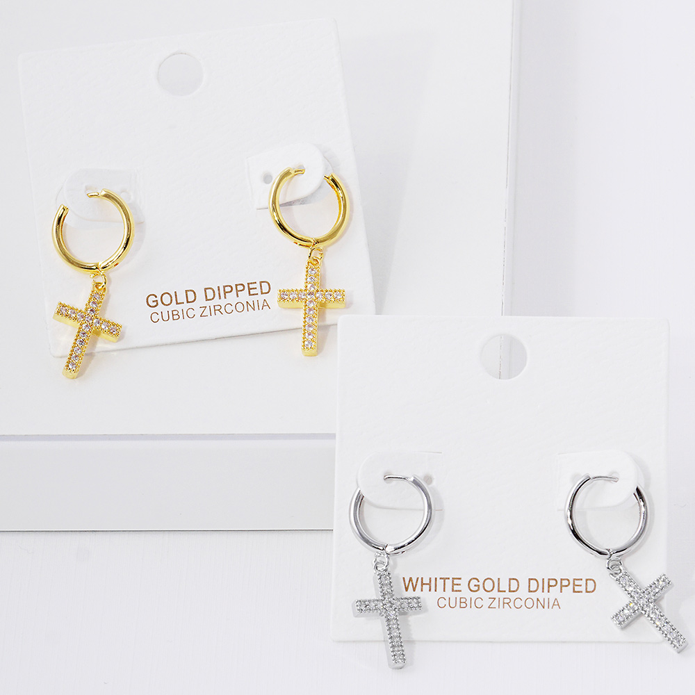 Gold Dipped CZ Stone Paved Cross Dangle Huggie Hoop Earrings