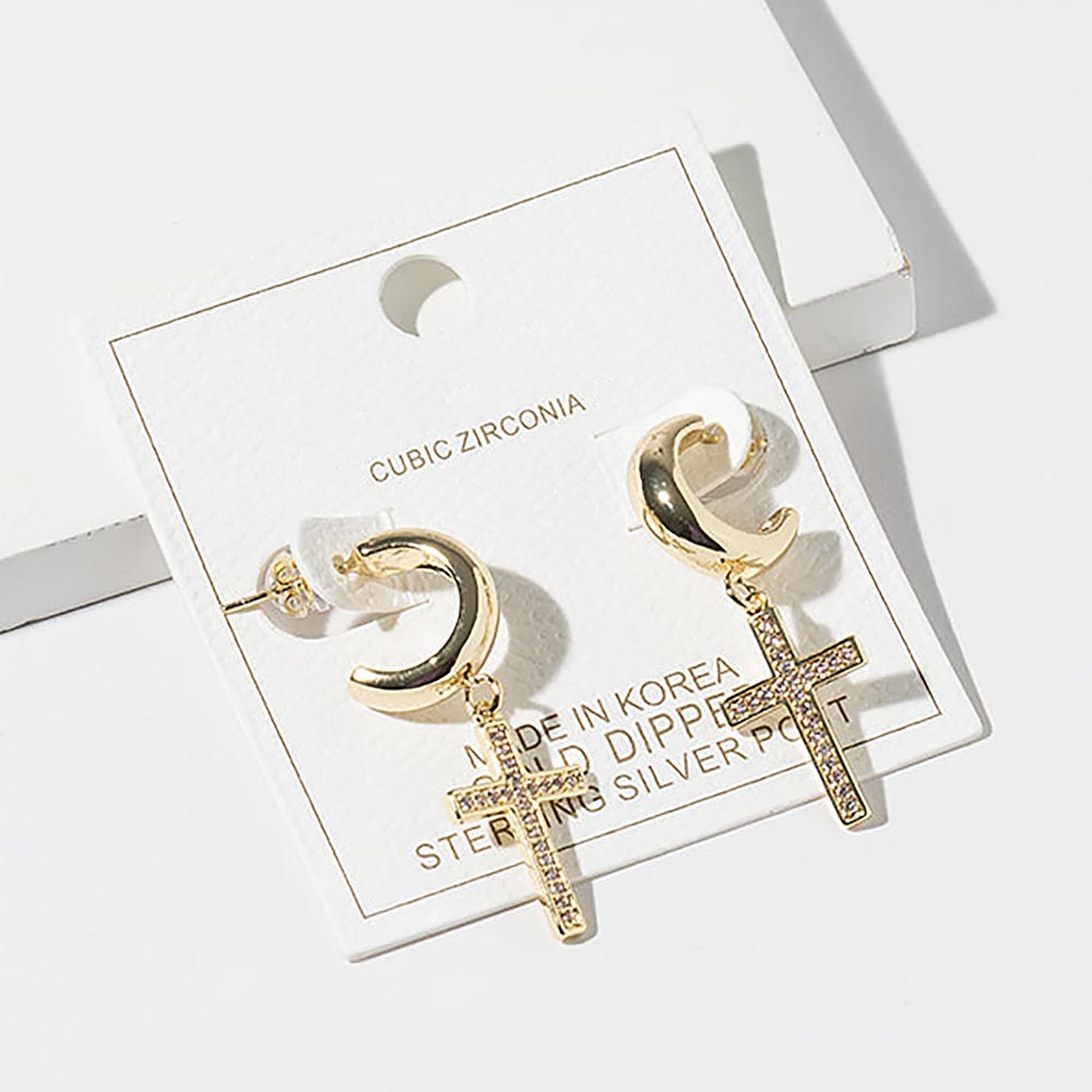 Gold Dipped CZ Stone Paved Cross Drop Dangle Mini Hoop Earrings