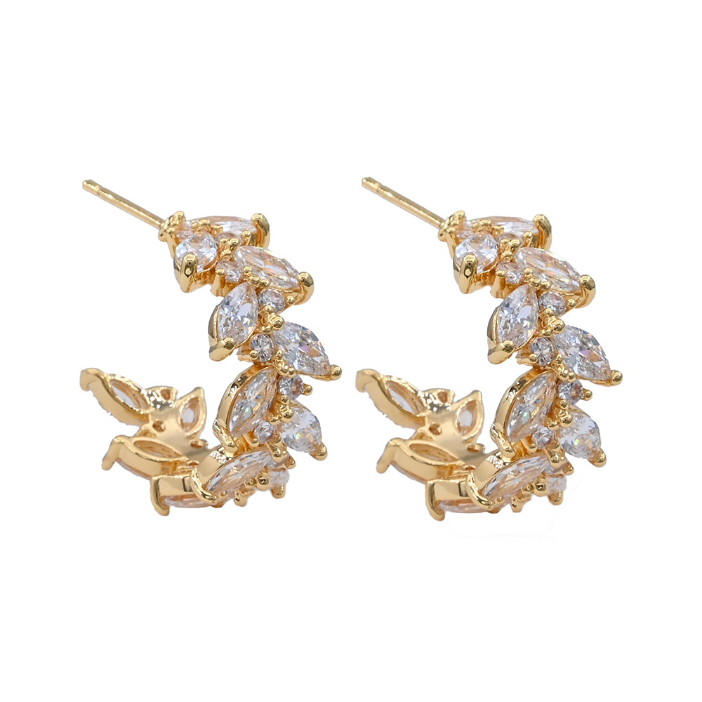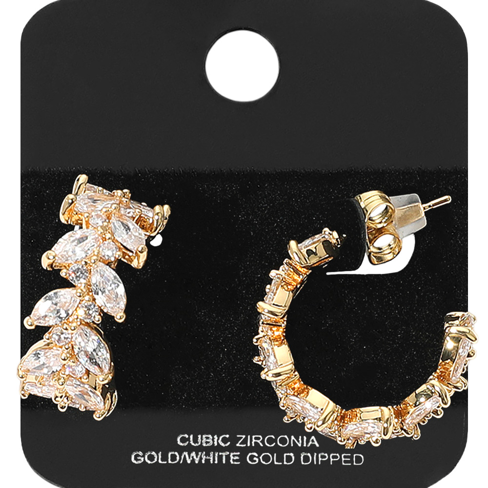 Details • Size : 1" X 0.9" X 0.4" • Post Back • Elegant hoop earrings adorned with marquise-cut cubic zirconia stones, arranged in a cascading design for maximum sparkle. Their unique shape adds sophistication, making them a versatile accessory that transitions seamlessly from casual chic to evening glamour. • CZ Cubic Zirconia • Gold Dipped • Lead and Nickel Compliant
