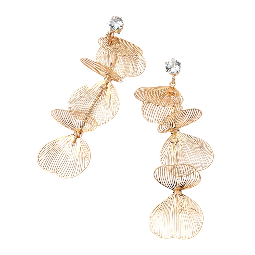 Details • Size : 0.8" X 2.75" • Post Back • Elegant multi layer drop statement earrings featuring a cascading sculpted design with airy openwork shapes and a refined crystal accent. Designed to create movement and dimension, these earrings elevate everyday outfits and special occasion looks with a bold yet graceful silhouette. Ideal for customers seeking modern statement drop earrings with a lightweight feel and eye-catching detail. • Lead and Nickel Compliant