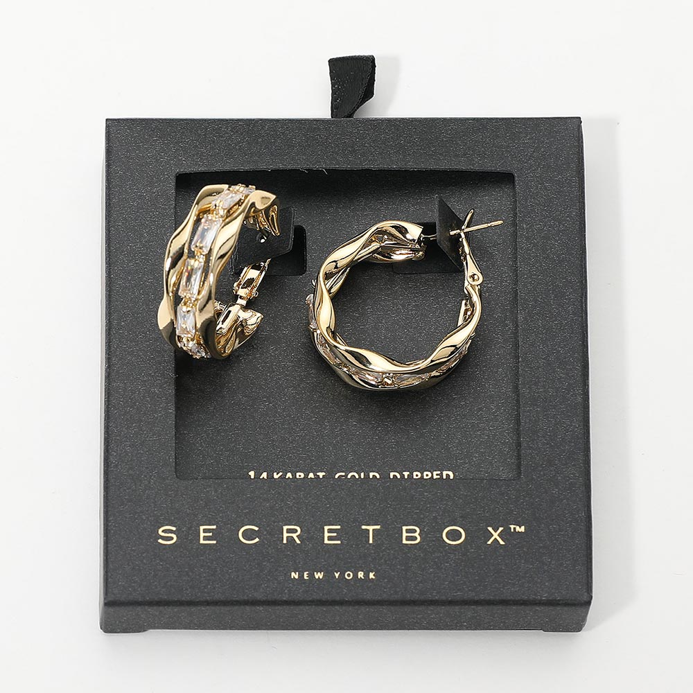 SECRET BOX_Sterling Silver Dipped Baguette Stone Embellished Twisted Hoop Earrings