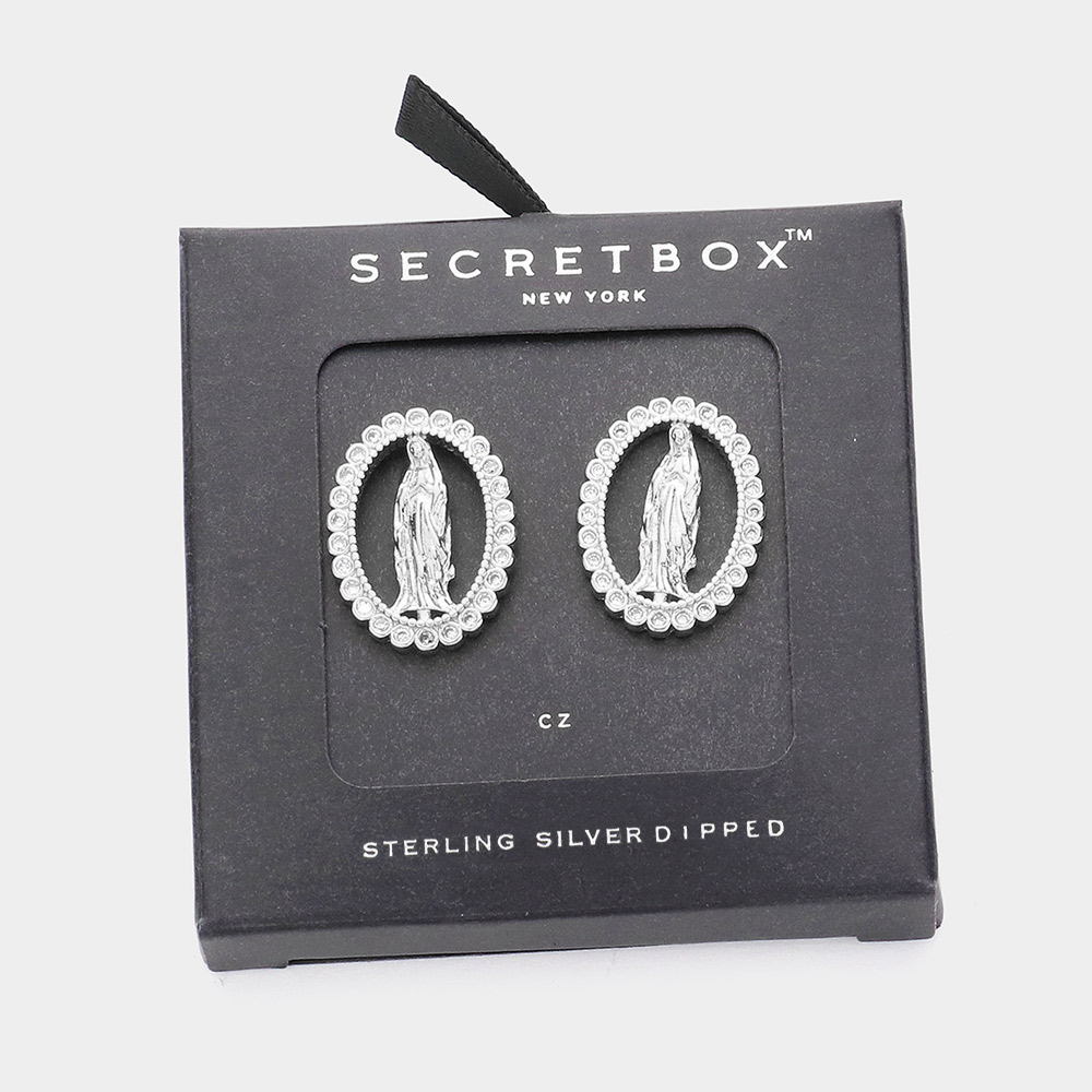 SECRET BOX_Sterling Silver Dipped CZ Stone Paved Virgin Mother Mary Stud Earrings