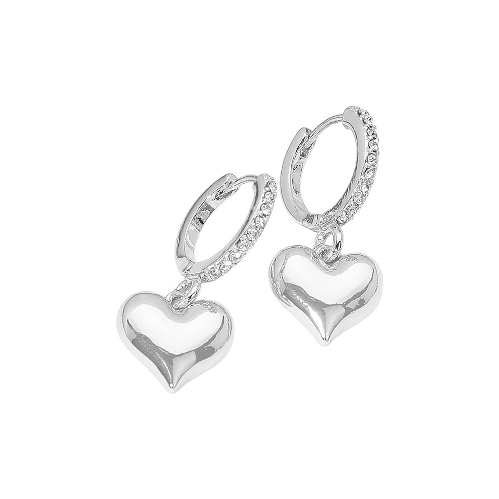 Silver Dipped Heart Charm Drop Dangle Stone Pave Huggie Hoop Earrings