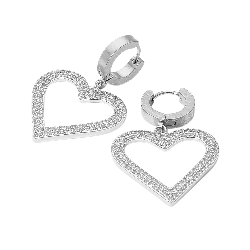 Stainless Steel CZ Stone Paved Open Heart Charm Dangle Huggie Earrings