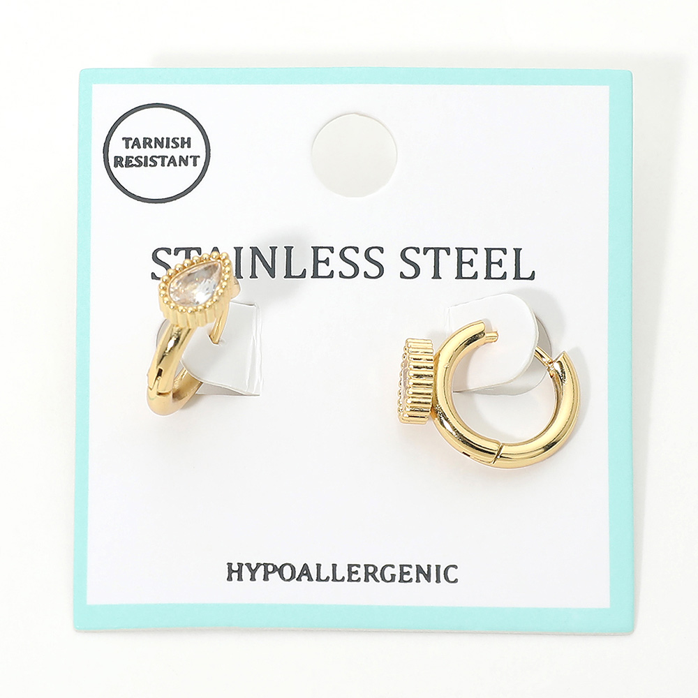 Details • Size : 0.6" X 0.6" X 0.25" • Huggie Back • Tarnish Resistant • Elegant huggie hoop earrings featuring a teardrop-shaped accent that adds refined sparkle to a clean, modern silhouette. Designed for comfortable daily wear, this versatile style works effortlessly for casual looks, special occasions, gifting, and boutique jewelry assortments. • Hypoallergenic • Stainless Steel
