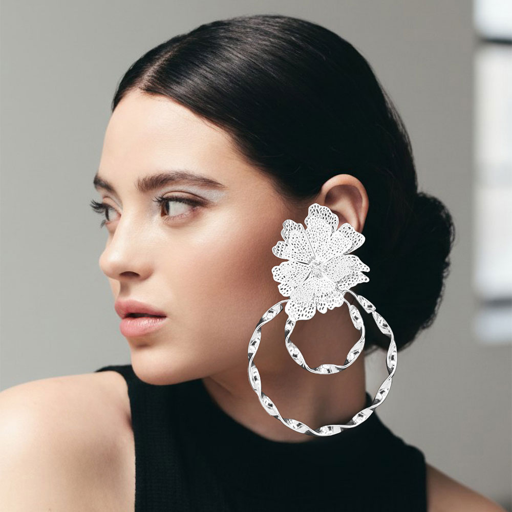 Details • Size : 2.25" X 3.5" • Post Back • Elevate your style with these elegant floral hoop statement earrings featuring a delicate flower accent paired with bold, twisted drop hoops for striking visual contrast. Designed for standout sparkle and everyday comfort, they transition seamlessly from casual wear to evening looks and make a chic, gift-ready accessory. • Lead and Nickel Compliant